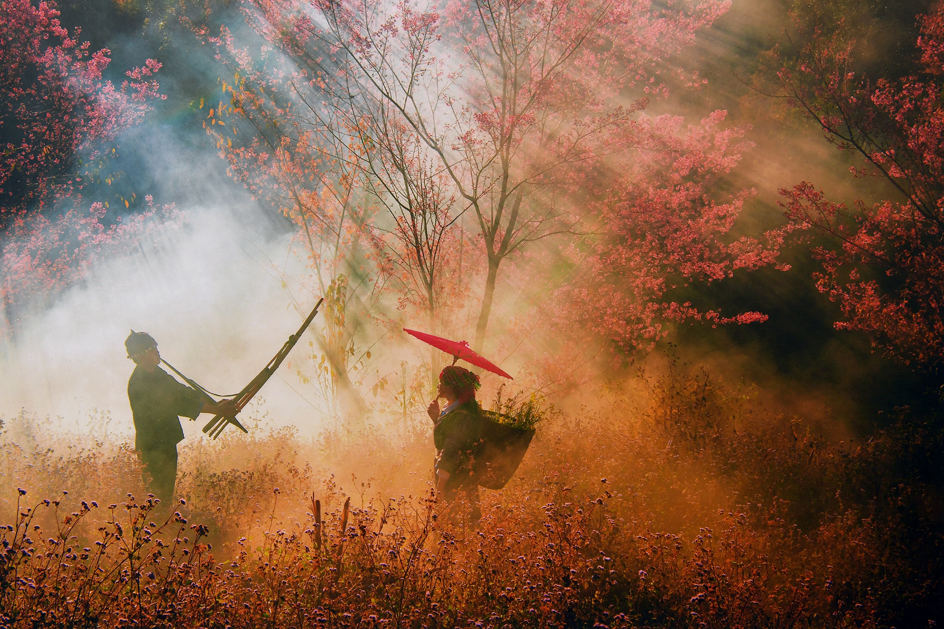 Tác phẩm: "Giai điệu tình yêu" ghi lại cảnh chàng trai thổi khèn trong vườn hoa tớ dày ở Lào Cai của Phan Huy Thiệp.