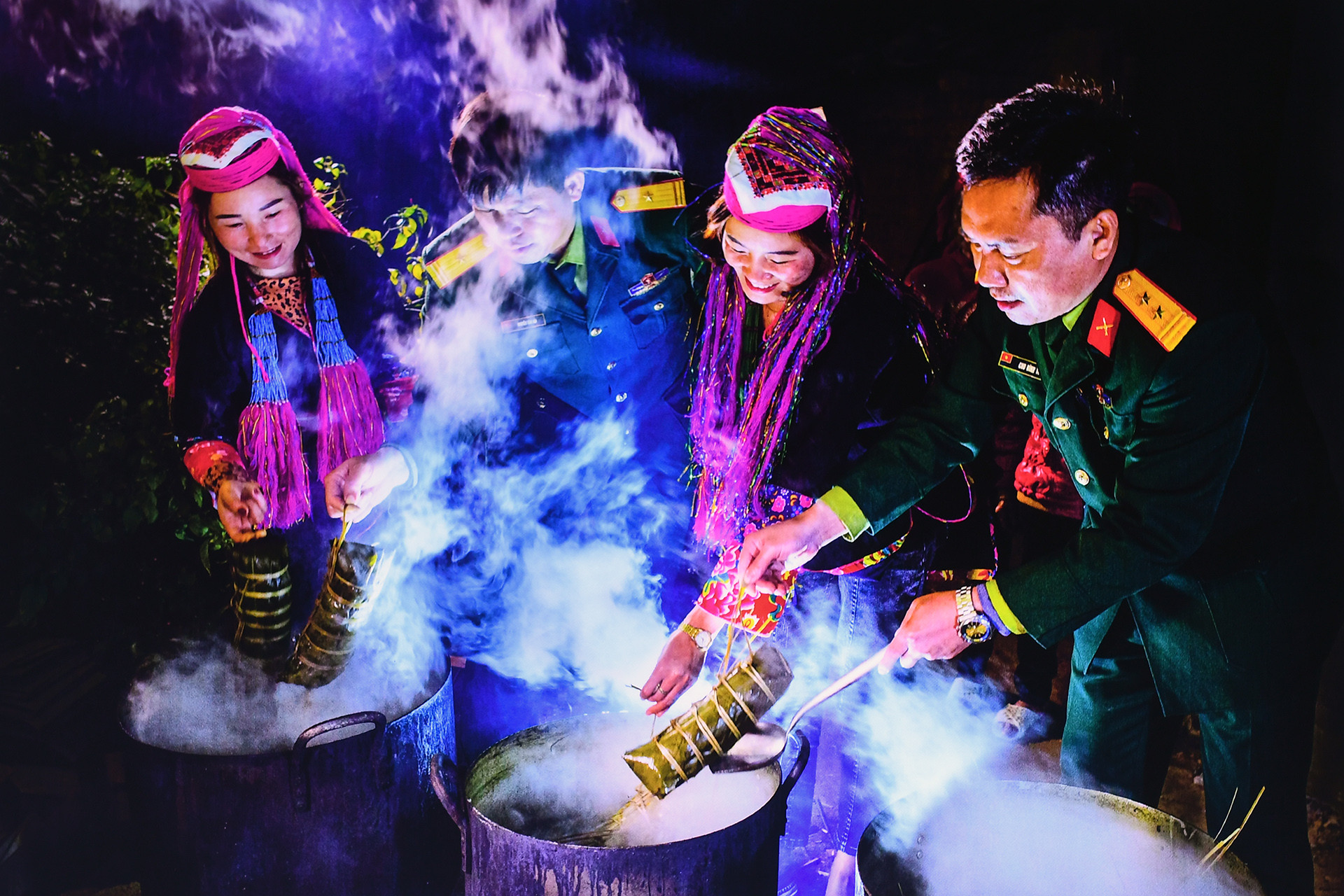 Tác phẩm: "Đón xuân" ghi lại cảnh quân và dân cùng luộc bánh chưng đón Tết của Dương Phương Đại.