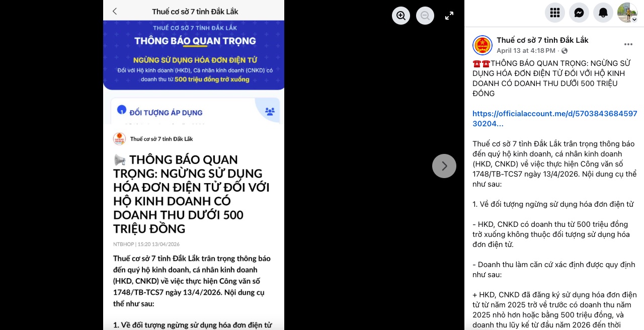 Thông báo của Thuế cơ sở 7 Đắk Lắk về việc ngừng sử dụng hóa đơn với hộ kinh doanh có doanh thu dưới 500 triệu đồng. (Ảnh chụp màn hình)