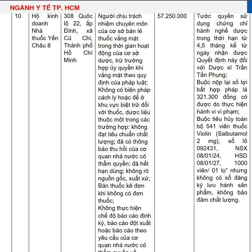 Sở Y tế Thành phố Hồ Chí Minh vừa công khai xử phạt hành chính đối với Hộ kinh doanh Nhà thuốc Yến Châu 8 (308 Quốc lộ 22, ấp Đình, xã Củ Chi, Thành phố Hồ Chí Minh), số tiền 57,250 triệu đồng.
