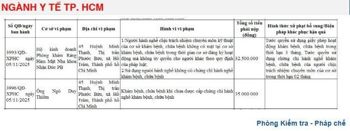 Cụ thể, Hộ kinh doanh Phòng khám Răng Hàm Mặt Nha khoa Nhân Đức PB (45 Huỳnh Minh Thạnh, xã Hồ Tràm, TP HCM) bị xử phạt hành chính số tiền 32.500.000 đồng theo Quyết định số 3993/QĐ-XPHC ngày 5/11/2/25.