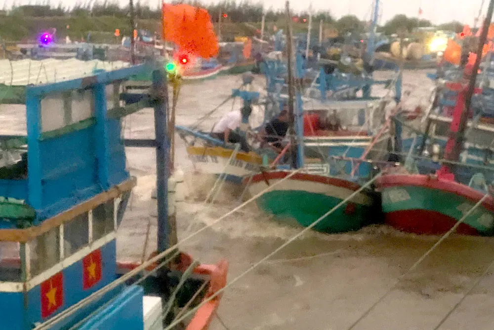 Hàng chục chiếc thuyền neo tại cửa cảng Liên Hương bị chìm, đứt dây neo trôi ra biển.
