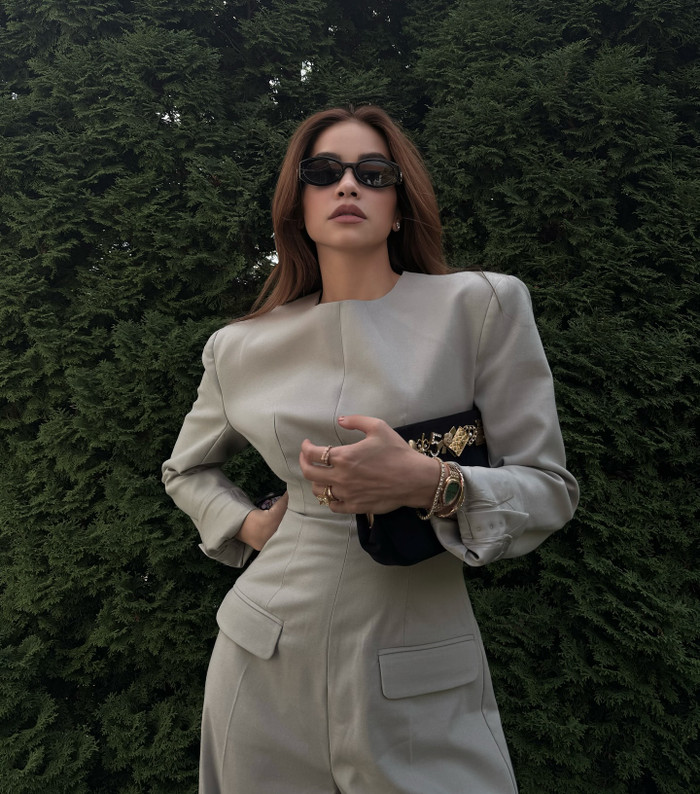 Điểm nhấn của outfit nằm ở phụ kiện làn chiếc kính mắt oval nhỏ gọn, khuyên tai dáng móc kim loại và đặc biệt là chiếc vòng cổ điểm xuyết charm túi mini tinh xảo, chi tiết giúp tổng thể thêm thời thượng.