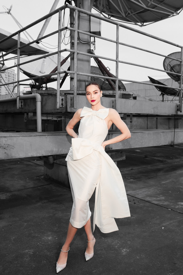 Hồ Ngọc Hà trong bộ váy trắng ôm body tôn lên đường nét cơ thể và không quên kết hợp thêm phụ kiện làm điểm nhấn (Ảnh: ISNV).