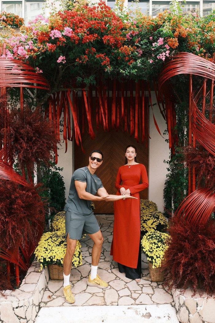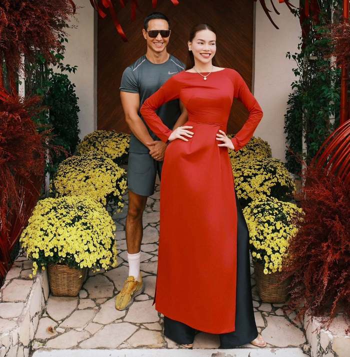 Hồ Ngọc Hà diện áo dài đỏ chụp hình trước cổng nhà cùng Kim Lý. Ảnh: FBNV