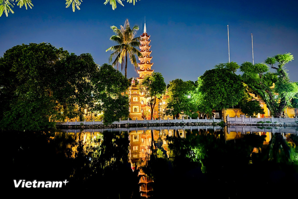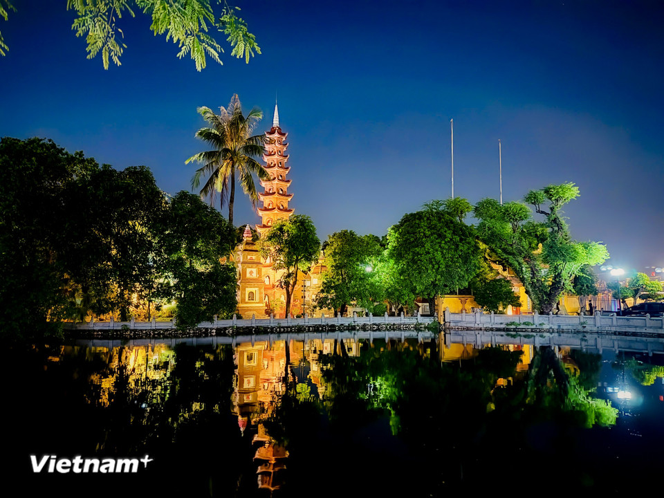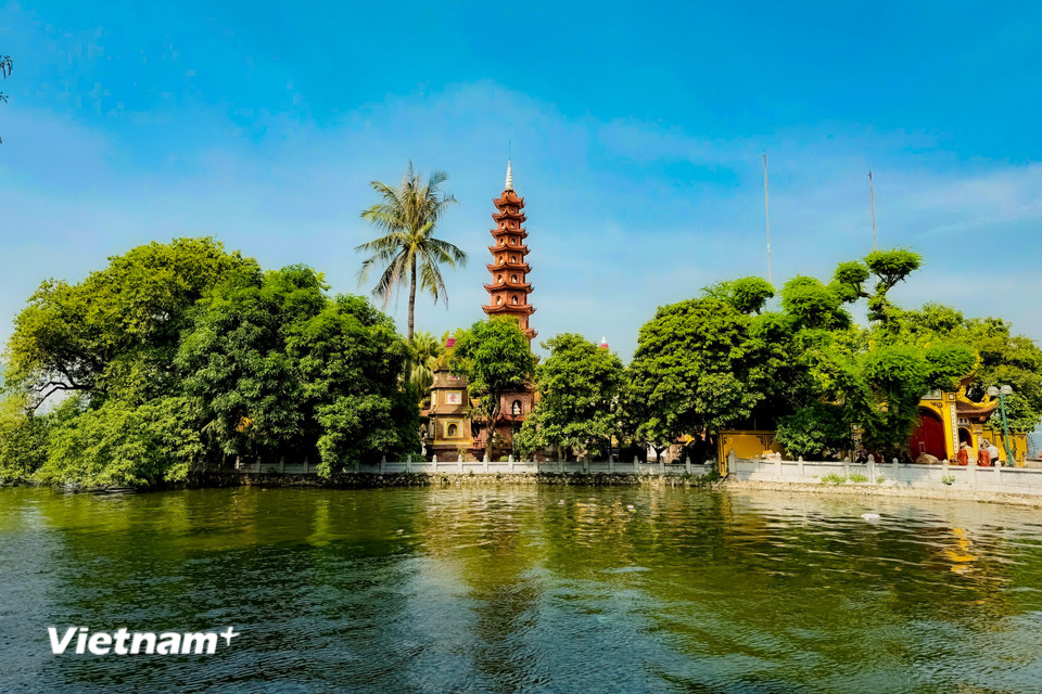 Mà còn bởi những nét trầm mặc hòa trên mái ngói của những ngôi chùa cổ kính với kiến trúc mang giá trị nghệ thuật cao như chùa Trấn Quốc. (Ảnh: Trần Hương Sơn/Vietnam+)