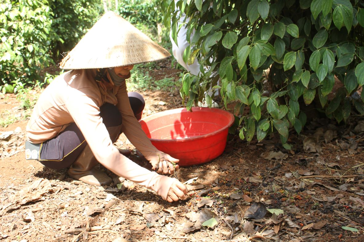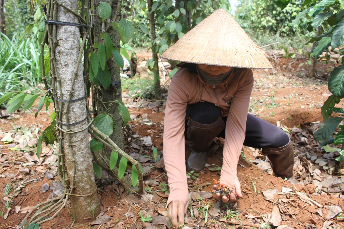 Người dân nhặt trái hồ tiêu rụng dưới đất. Ảnh: T.T