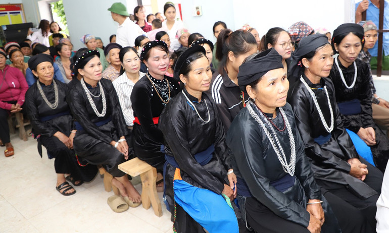 Người dân trong thôn mặc những bộ váy áo truyền thống đến dự Ngày hội Đại đoàn kết.