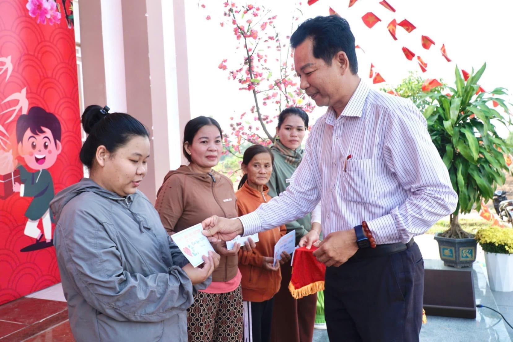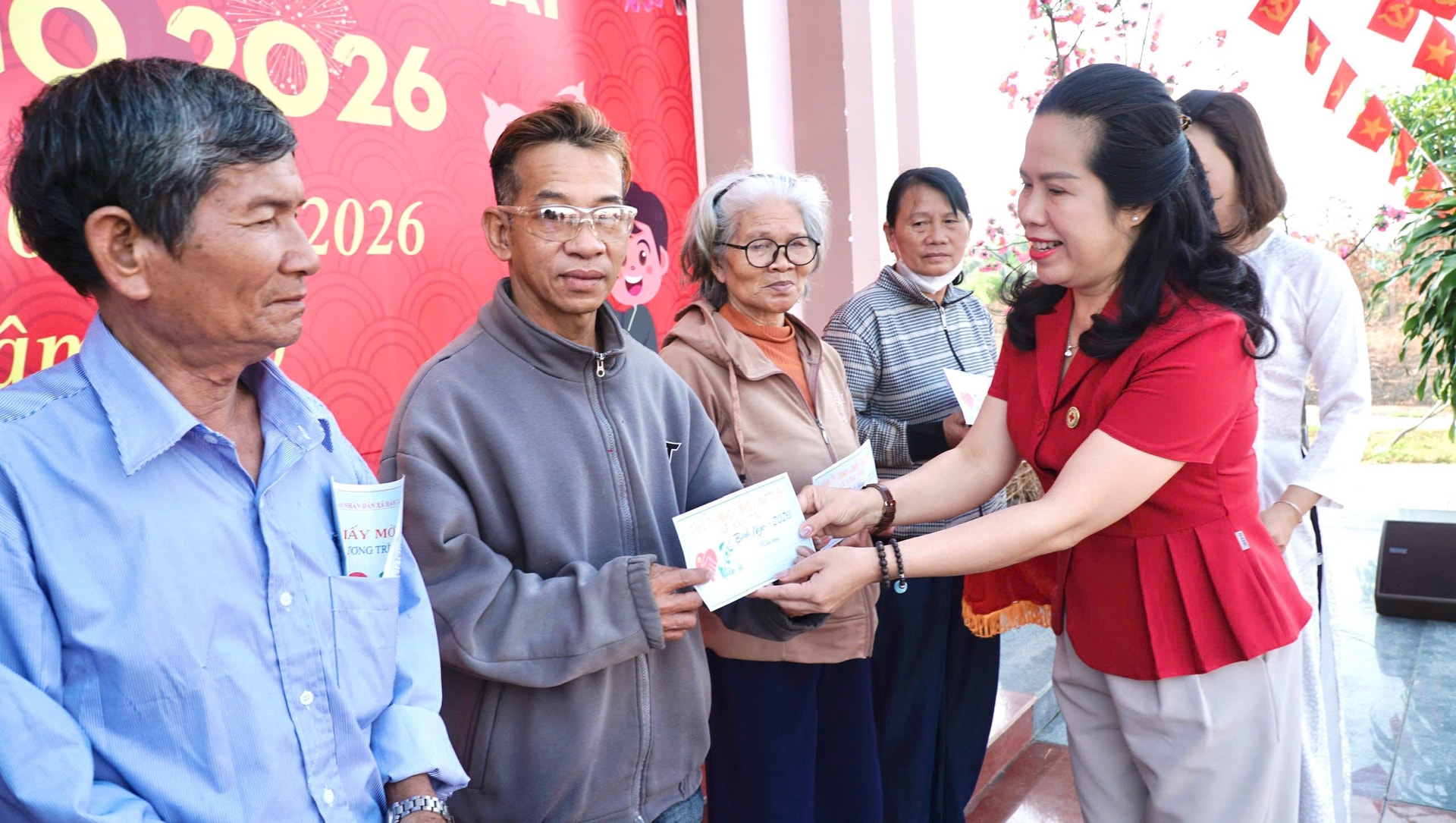 Bí thư Đảng ủy xã Hàm Tân (tỉnh Lâm Đồng) Dương Văn Đông (áo xanh đậm) và bà Nguyễn Thị Thanh Nhàn, Phó Chủ tịch Hội Chữ thập đỏ tỉnh trao quà cho người nghèo dịp Tết Nguyên đán 2026