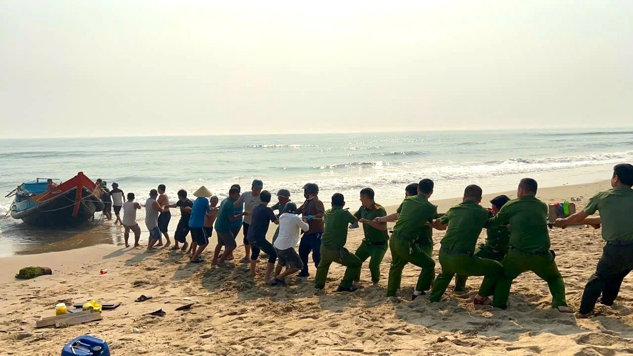 Người dân và lực lượng chức năng xã Đông Trạch tham gia hỗ trợ thuyền đánh cá gặp nạn - Ảnh: T.L
