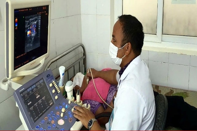 Bác sĩ Chuyên khoa I Điểu Đoan đang siêu âm tuyến giáp cho bệnh nhân tại Trung tâm Y tế khu vực Tuy Đức