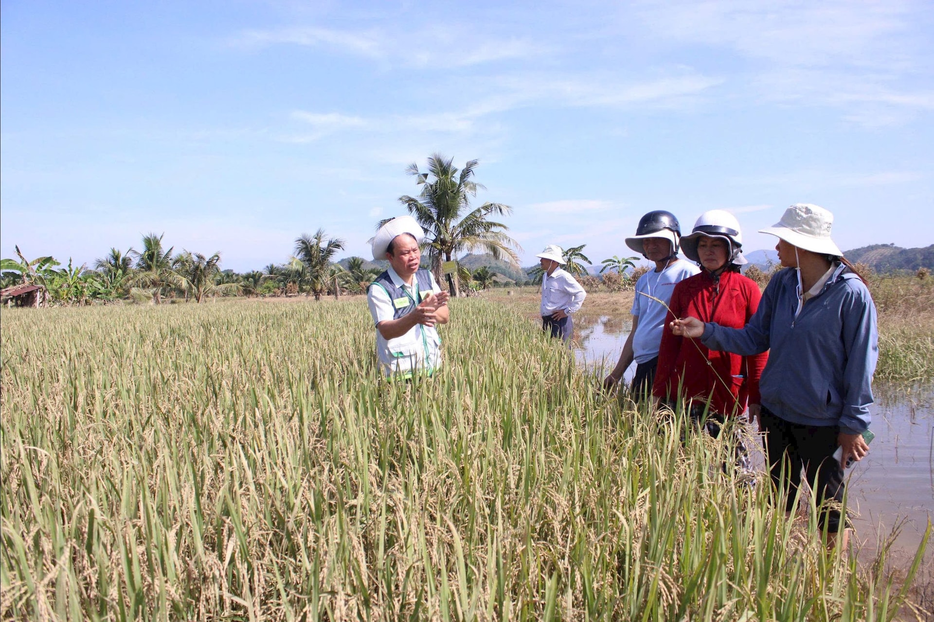Cán bộ khuyến nông hướng dẫn nông dân các giải pháp khắc phục lúa sau mưa lũ.
