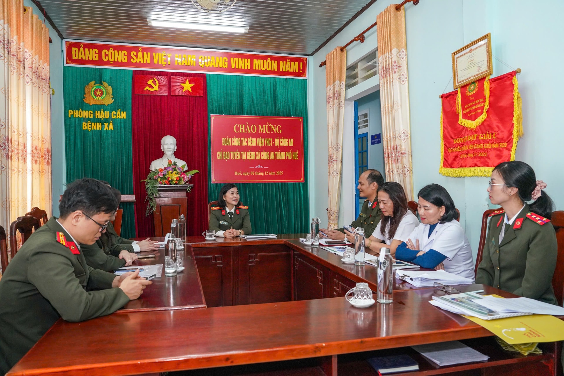 Các y, bác sĩ của Bệnh viện Y học cổ truyền, Bộ Công an trao đổi chuyên môn về công tác khám chữa bệnh với đội ngũ y tế Bệnh xá Công an TP. Huế.