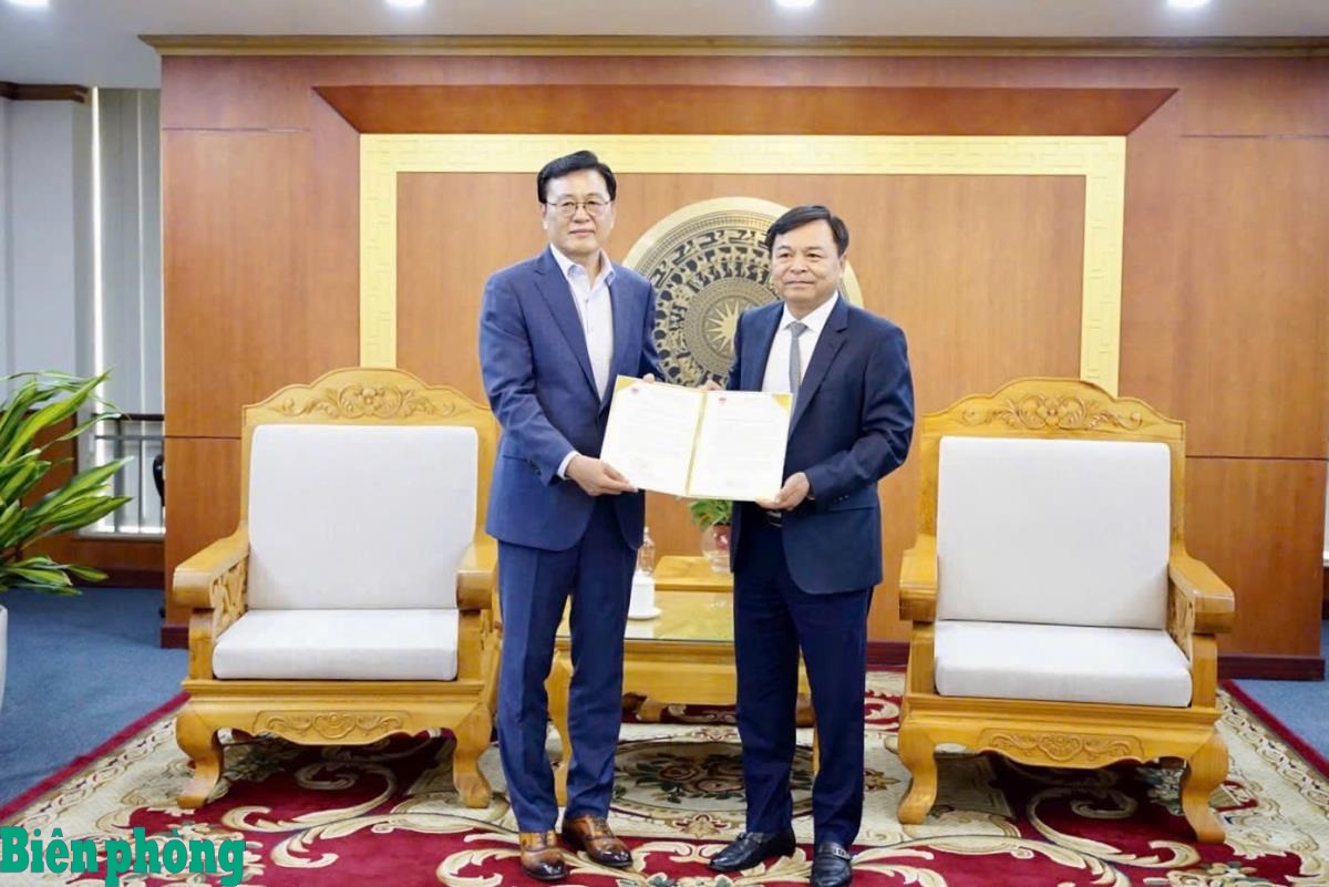 Thứ trưởng Bộ Nông nghiệp và Môi trường Nguyễn Hoàng Hiệp (bên phải) tiếp nhận kinh phí hỗ trợ của Công ty TNHH S-TEC System do ông Lee Choong Yun, Phó Chủ tịch Công ty trao. Ảnh: T.V