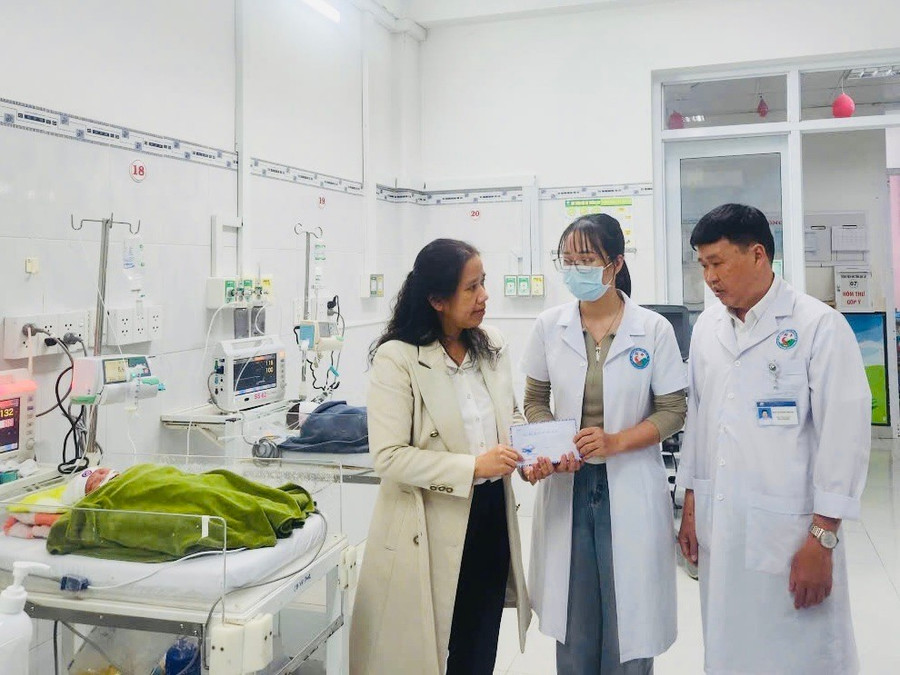Phó Giám đốc Sở Y tế Ksor Hiền (ngoài cùng bên trái) đến thăm và trao 2 triệu đồng hỗ trợ chăm sóc cho bé sơ sinh bị bỏ rơi tại xã Ia Mơ. Ảnh: CTV