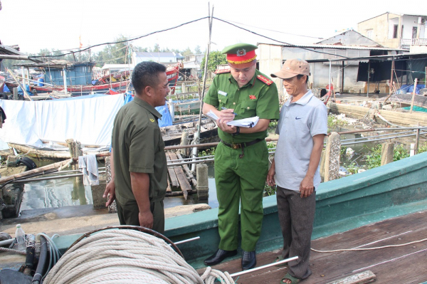 Cán bộ Công an phường Thuận An (TP Huế) kiểm tra thông tin, tuyên truyền ngư dân khai thác hải sản đúng quy định.