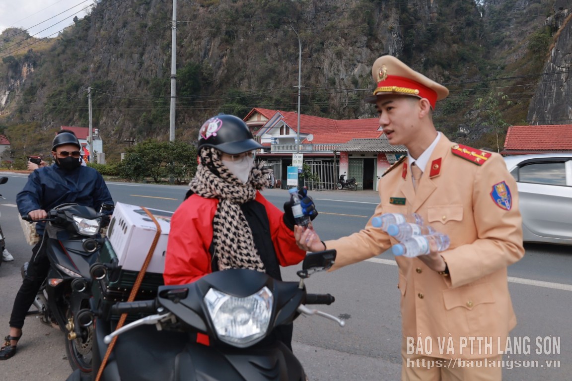 Cán bộ trạm CSGT Tùng Diễn phát nước miễn phí cho người dân tham gia giao thông trên tuyến Quốc lộ 1, đoạn qua địa bàn xã Chi Lăng, tỉnh Lạng Sơn