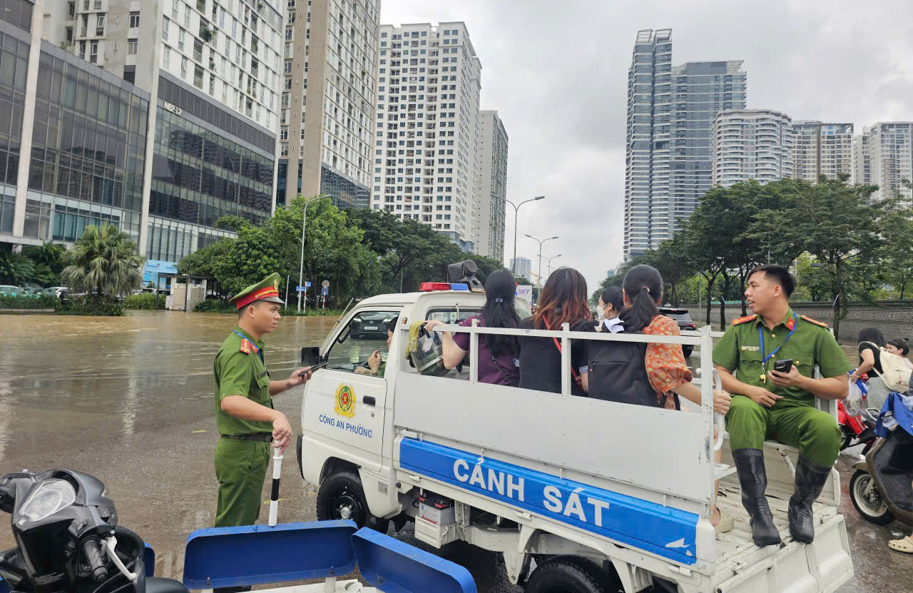 Các xe chuyên dụng của Công an phường Xuân Đỉnh hoạt động liên tục để hỗ trợ nhân dân di chuyển qua vùng ngập