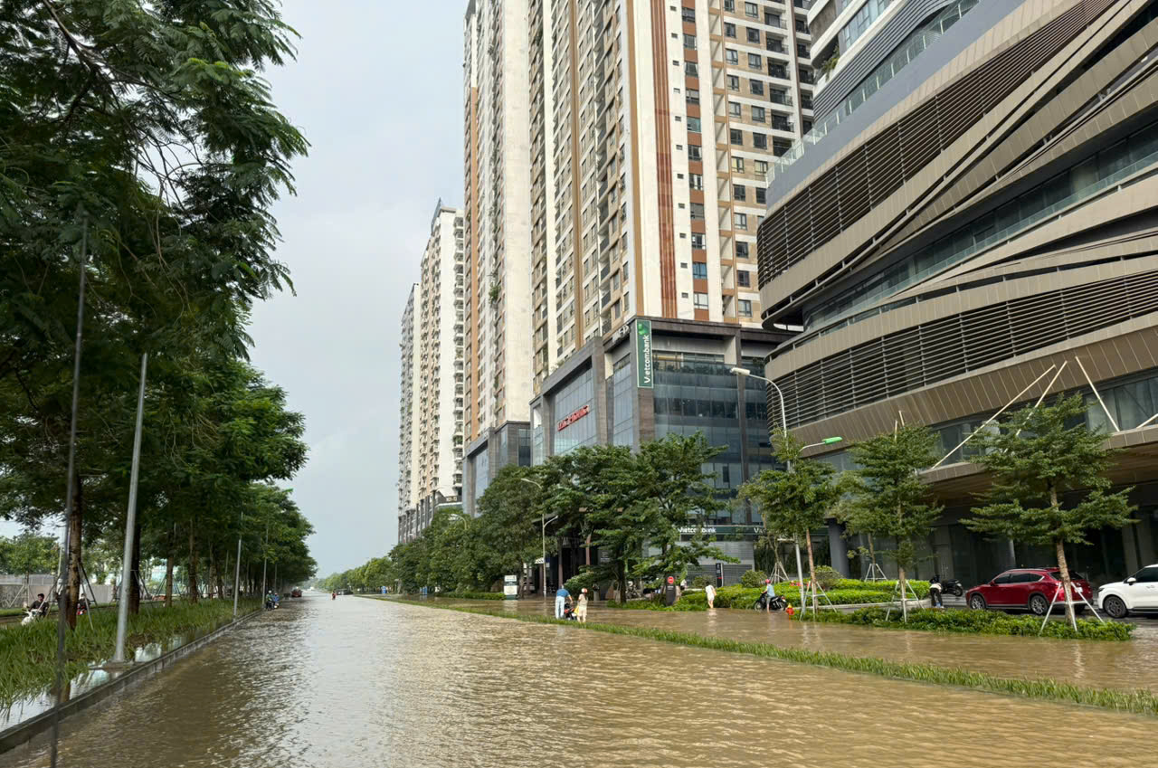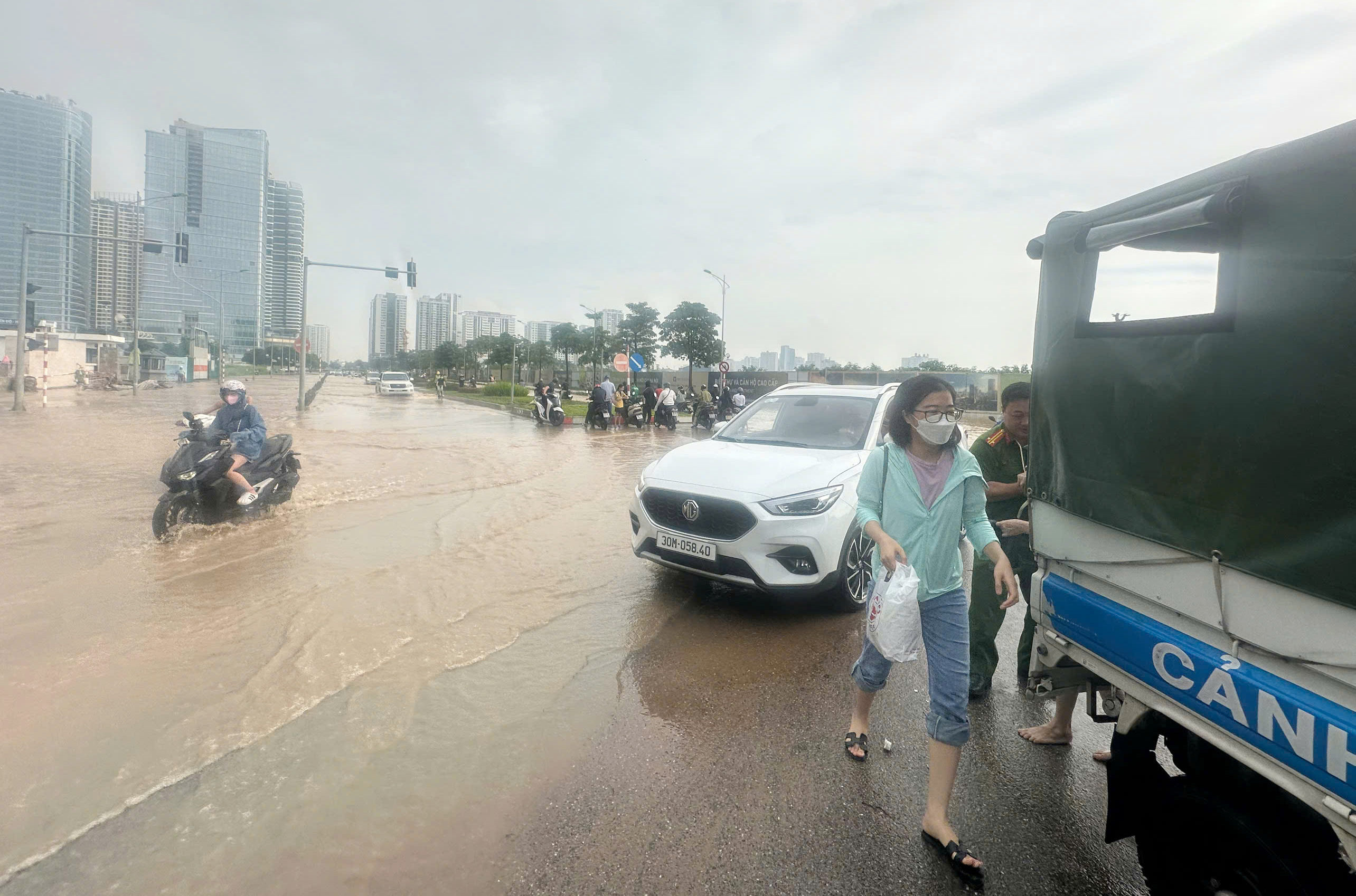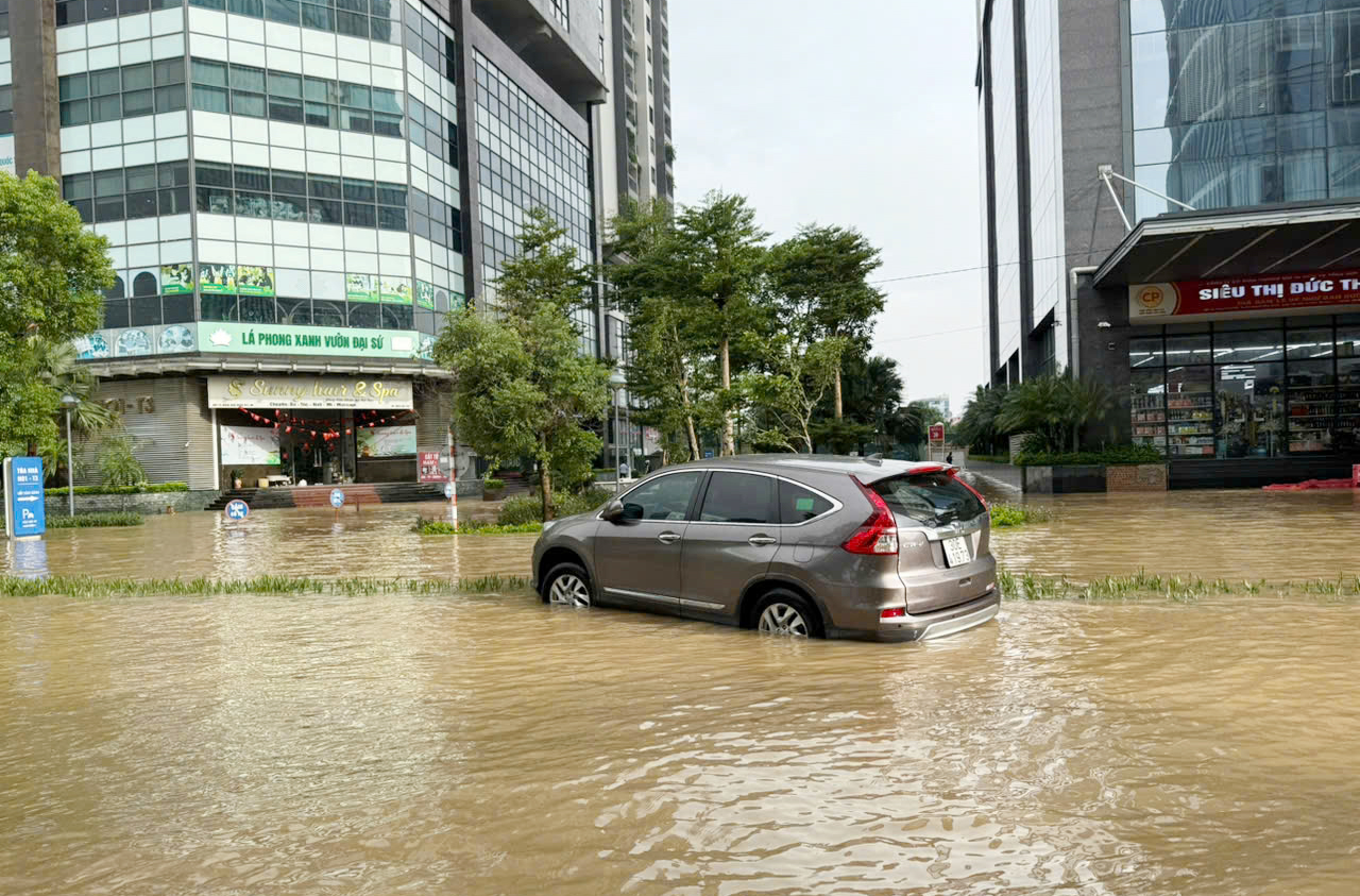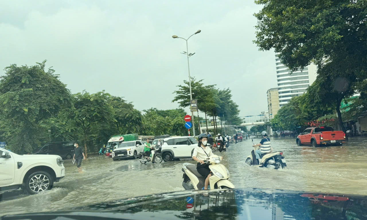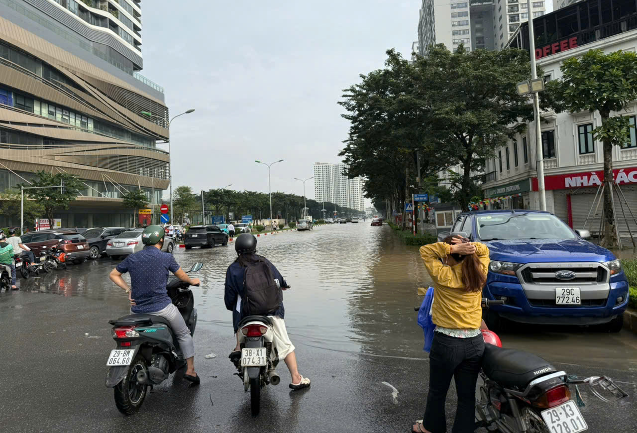 Sáng 1-10, khu Ngoại giao đoàn trên địa bàn phường Xuân Đỉnh vẫn bị ngập sâu, gây khó khăn cho người dân trong khi di chuyển