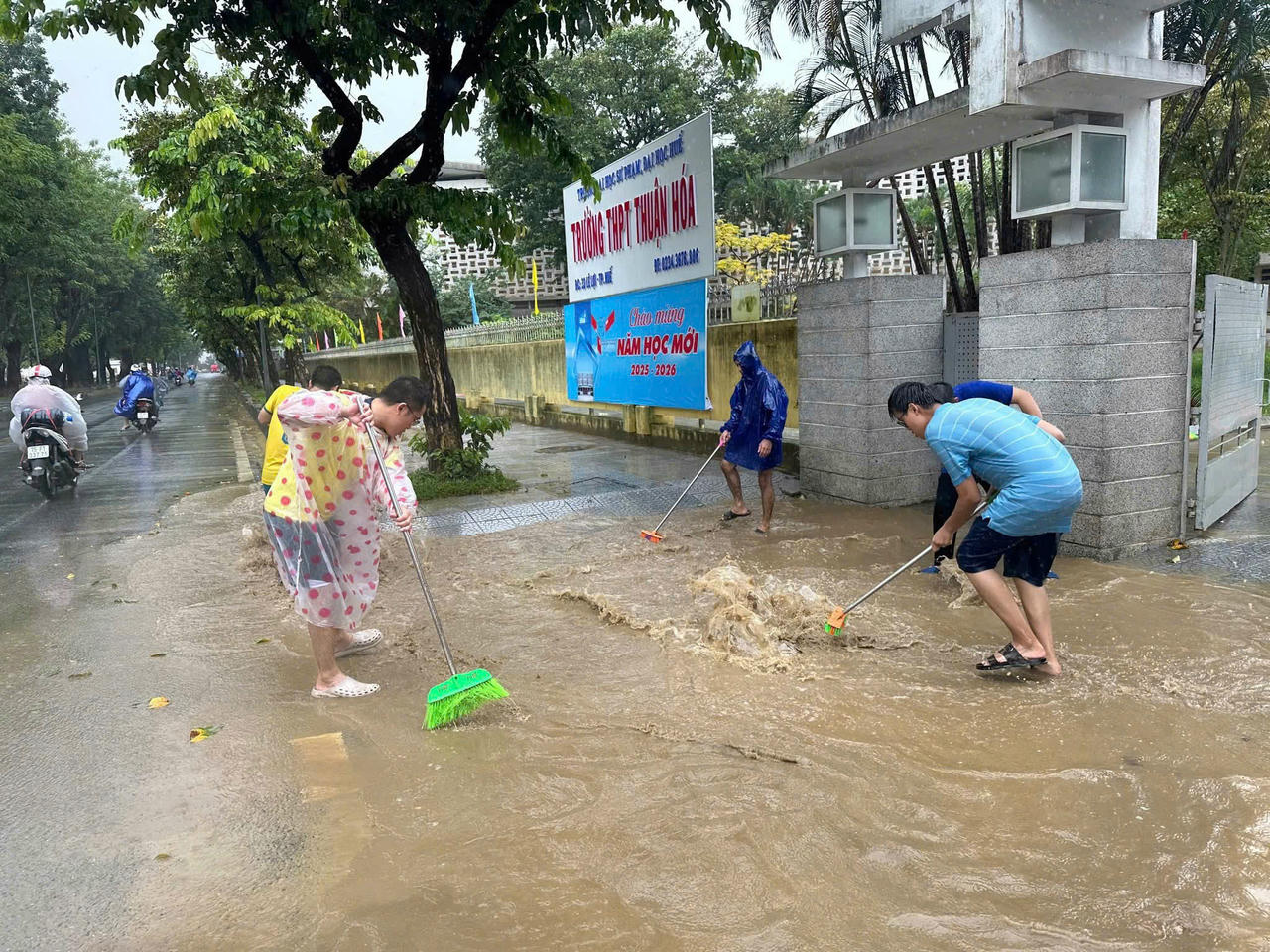Thầy và trò trường THPT Thuận Hóa - Đại học Sư phạm (ĐH Huế) tích cực dọn dẹp trường học sau mưa lũ (Ảnh: Dương Đức Giáp)