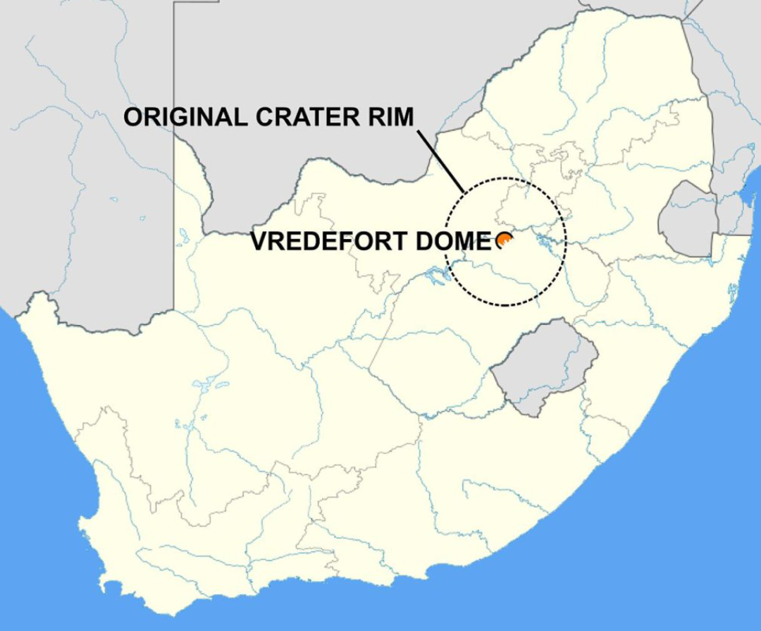 Vredefort rộng 300 km là hố va chạm lớn nhất từng được biết đến trên Trái Đất. Nó được hình thành cách đây hơn hai tỷ năm, do va chạm của một tiểu hành tinh có đường kính 10-15 km di chuyển với tốc độ khoảng 70 km/giờ. Ảnh: @Đại học Free State.
