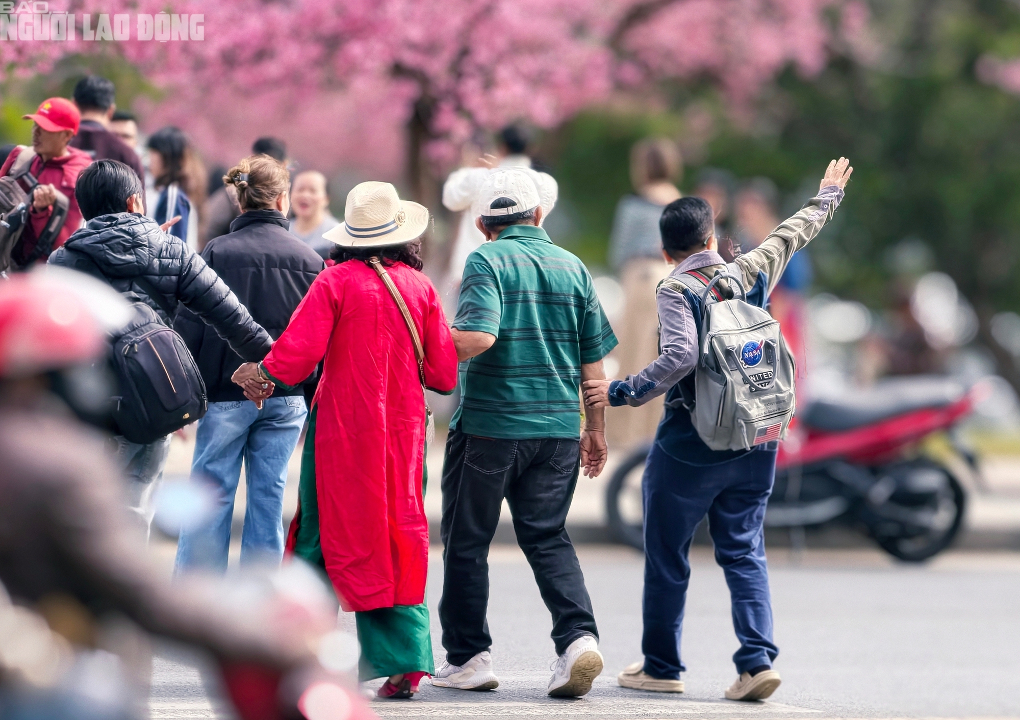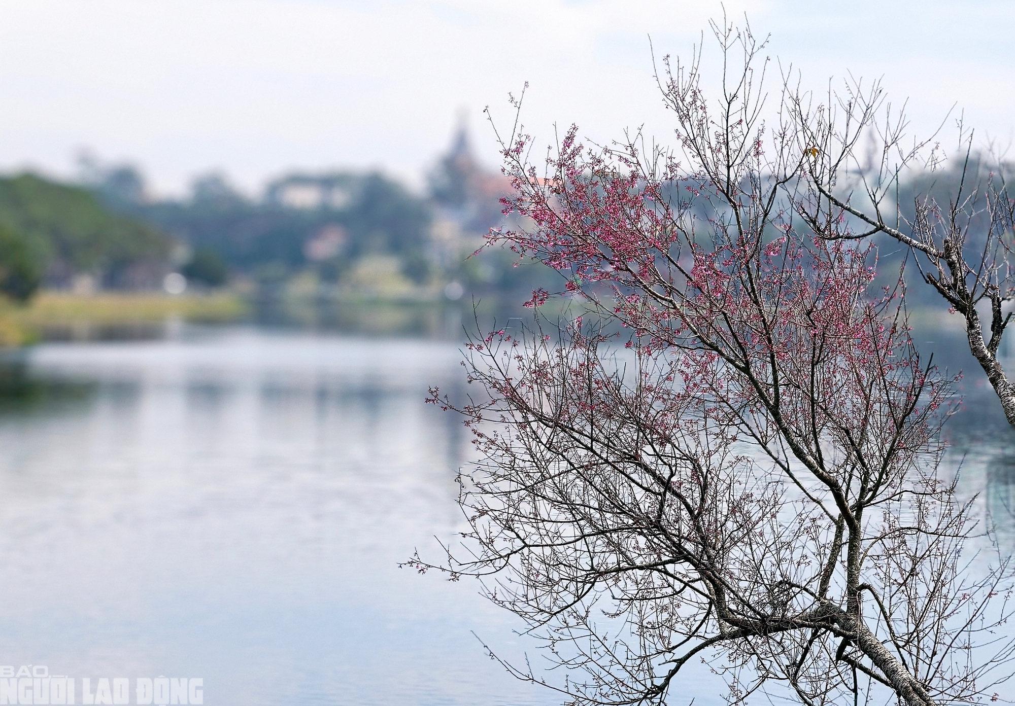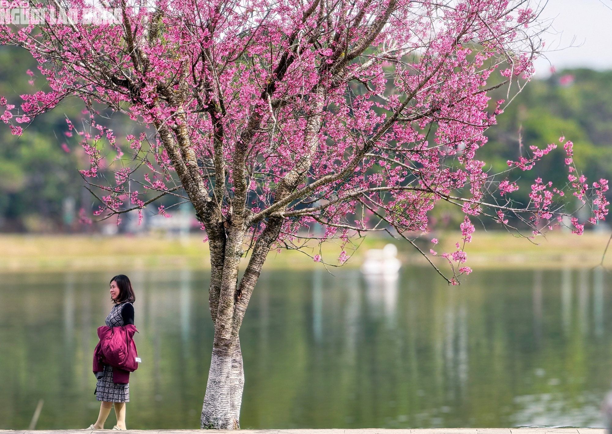 Trong đó, hàng trăm cây mai anh đào ven hồ Xuân Hương, đặc biệt là đoạn từ nhà hàng Thủy Tạ đến cầu Ông Đạo, đang vào mùa rộ nhất và đẹp nhất, tỏa sắc hồng xuống mặt nước của danh thắng quốc gia.