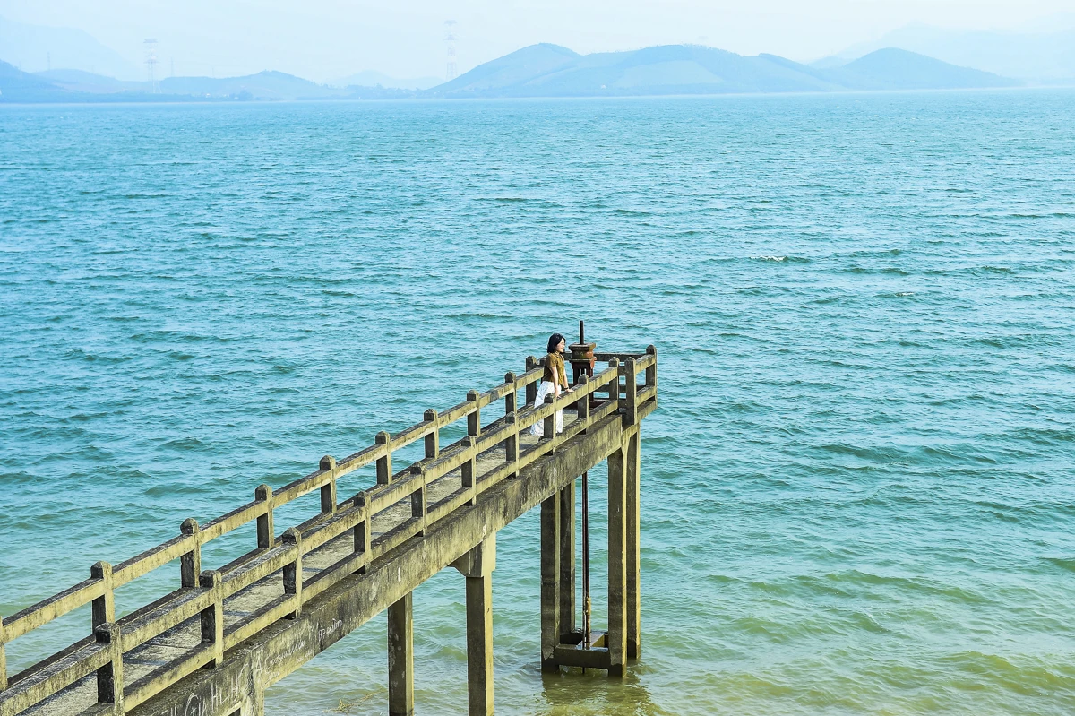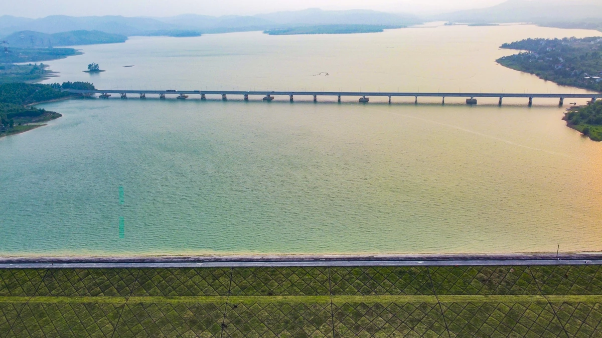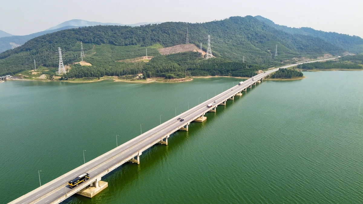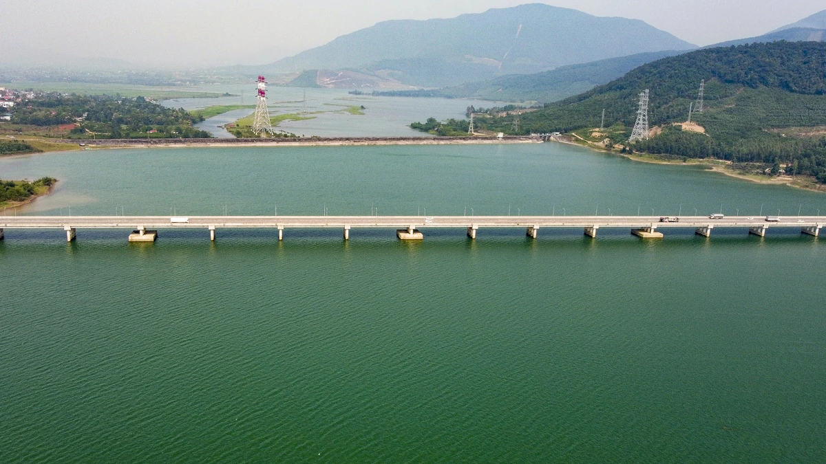 Từ trên cao, cây cầu vươn dài qua mặt nước rộng lớn, kết nối hai bờ giữa không gian núi non và lòng hồ mênh mang. Sự giao thoa giữa đường nét kiến trúc hiện đại với cảnh quan nguyên sơ tạo nên một góc nhìn giàu tính thẩm mỹ - vừa mạnh mẽ, khoáng đạt, vừa mềm mại, nên thơ.
