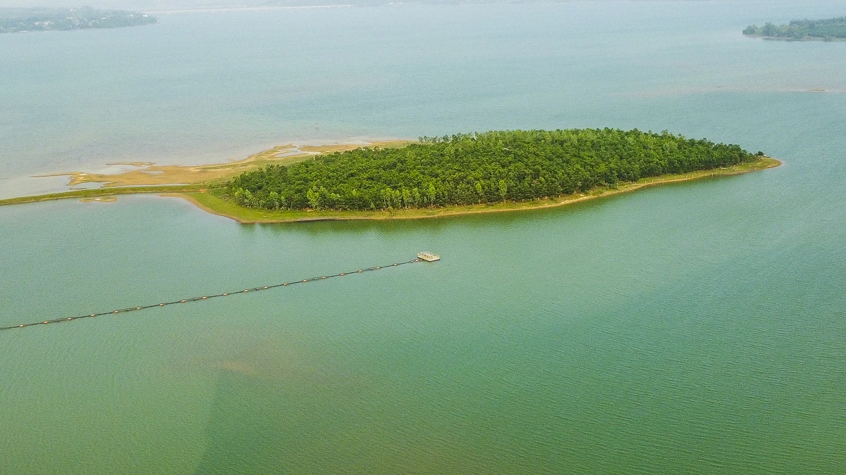 Xa xa là những cánh rừng xanh ngút ngàn, xen lẫn các thung lũng tự nhiên và triền đồi thoai thoải, hình thành nên các eo hồ, bán đảo hoang sơ. Tất cả hòa quyện, tạo nên một không gian khoáng đạt, đẹp như bức tranh thủy mặc, vừa hùng vĩ, vừa nên thơ.