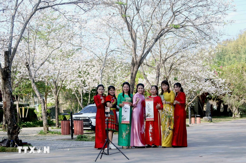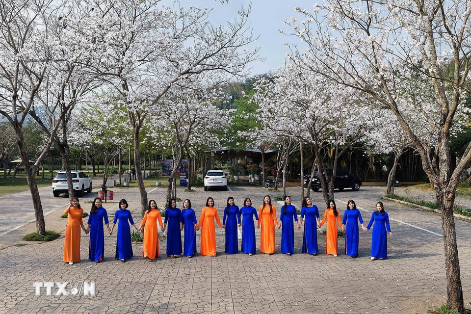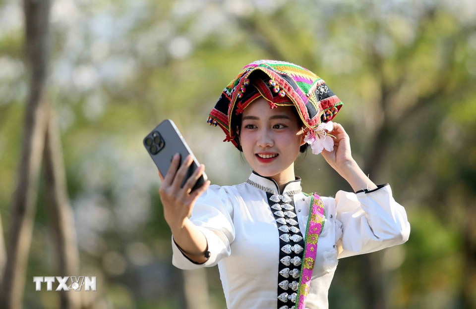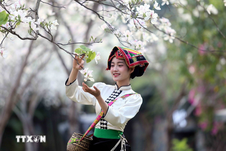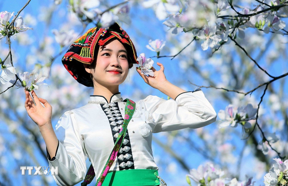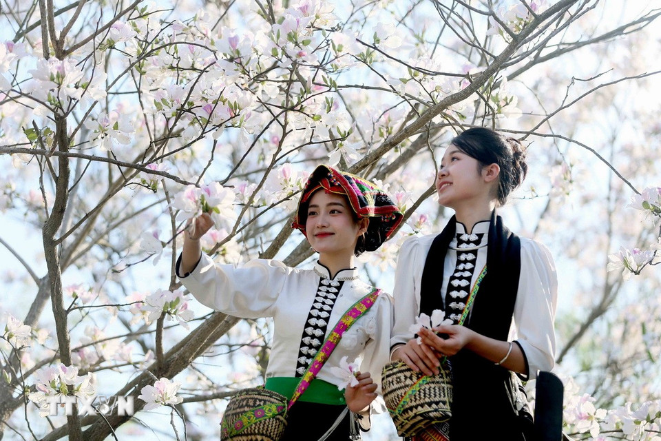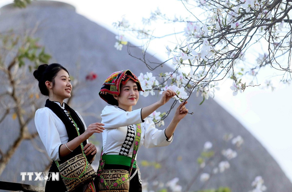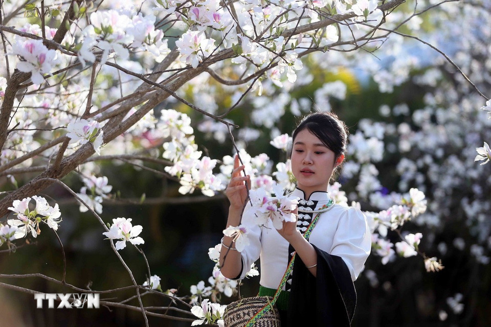 Vào mùa hoa ban nở, các bạn trẻ trong trang phục dân tộc Thái đến chiêm ngưỡng và chụp ảnh lưu niệm. (Ảnh: Quang Quyết/TTXVN)