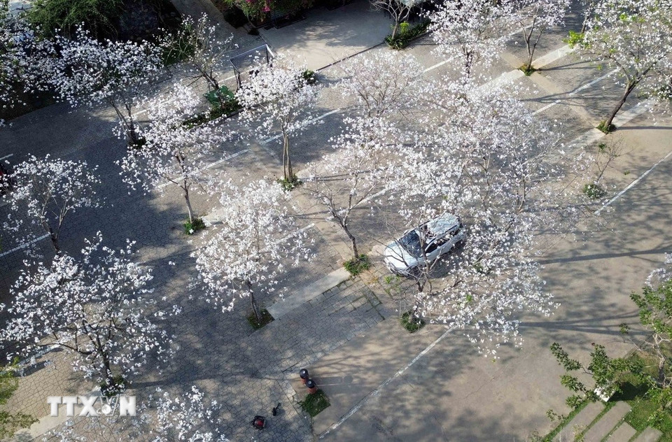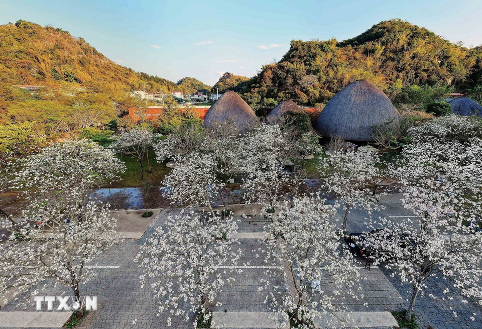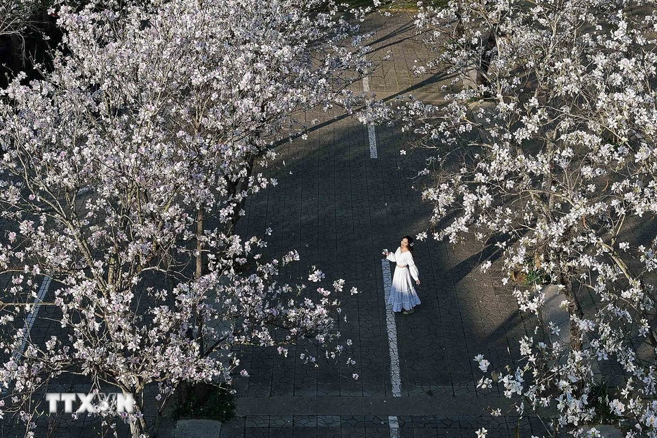 Tại quảng trường Tây Bắc, hoa ban đang bung nở trắng tinh khôi tạo khung cảnh lãng mạn, thơ mộng. (Ảnh: Quang Quyết/TTXVN)