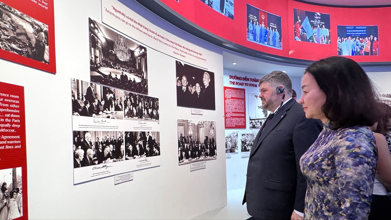 Tại không gian trưng bày, thông qua video chia sẻ từ xa, bà Nguyễn Thị Bình bày tỏ: “Khi nói về hành trình của mình, tôi luôn nghĩ đó không chỉ là hành trình của một người phụ nữ, mà là của rất nhiều phụ nữ trong giai đoạn đất nước đầy biến động. Tại Hội nghị Paris, những gương mặt nữ của đoàn Chính phủ Cách mạng lâm thời Cộng hòa Miền Nam Việt Nam thường xuyên xuất hiện tại bàn đàm phán đã minh họa điều đó”.