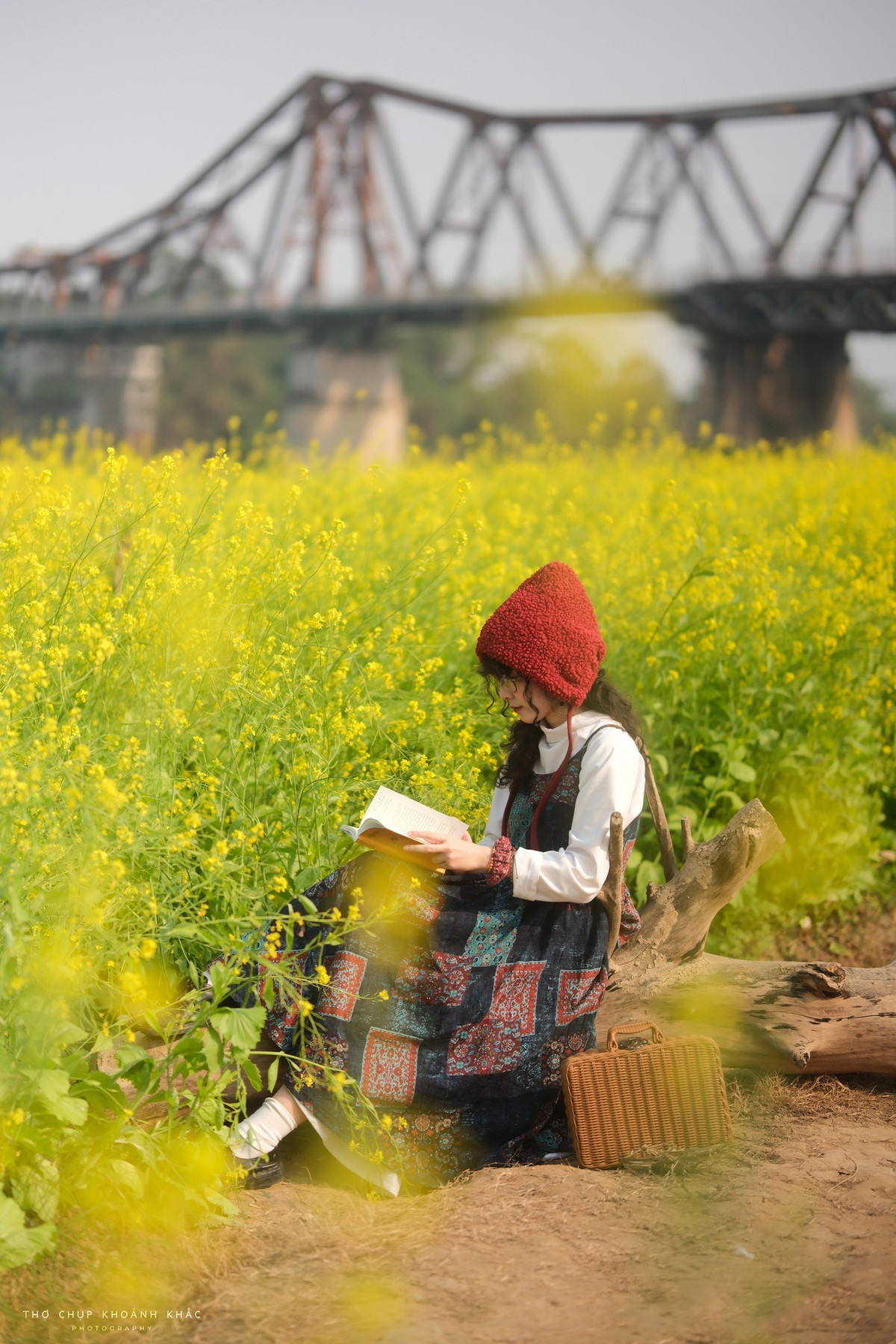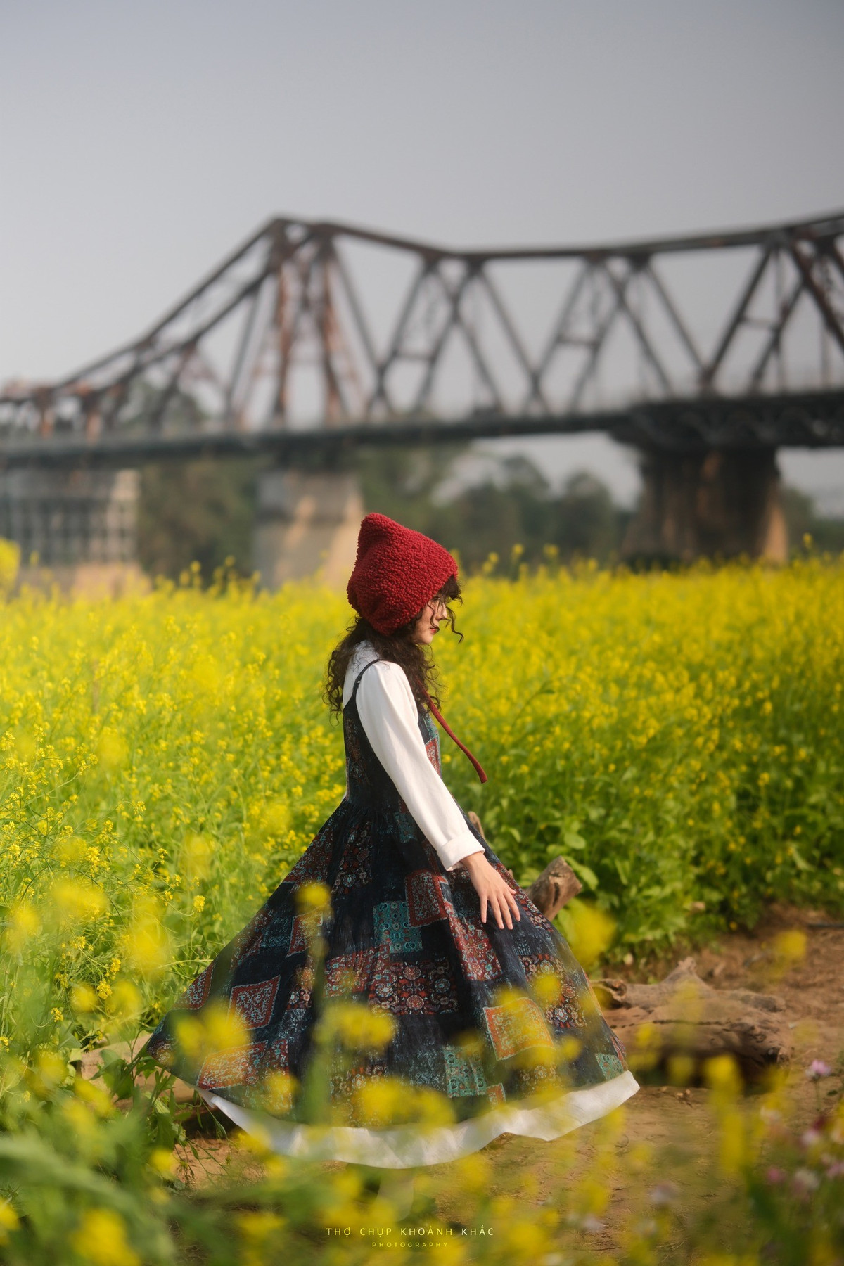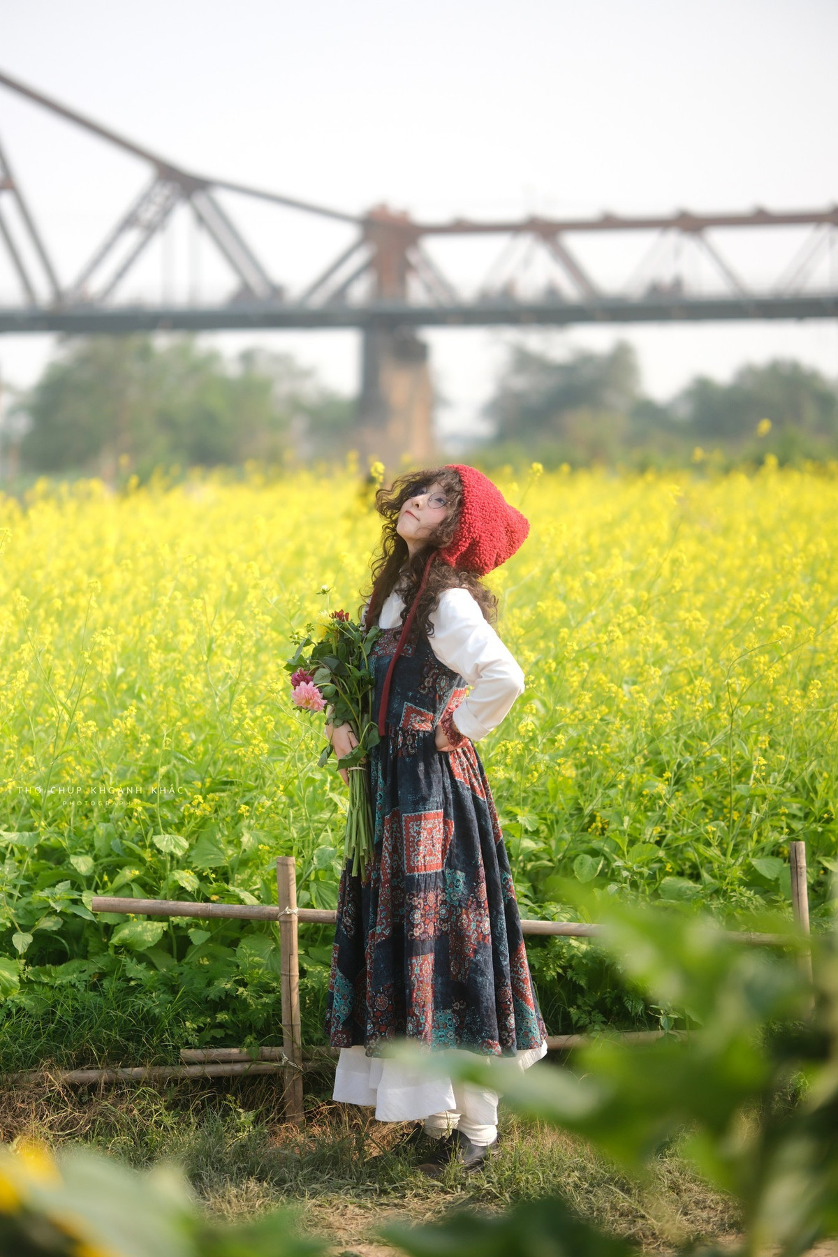 Phía xa xa, nhịp cầu Long Biên cổ kính sừng sững in bóng trên nền trời, tạo nên sự giao thoa độc đáo giữa vẻ đẹp kiến trúc lịch sử và nét mềm mại, rực rỡ của thiên nhiên. Ảnh Nguyen Thuong