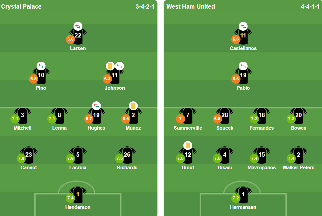 Sức ép của West Ham tiếp tục được duy trì trong hiệp hai. Trung vệ Konstantinos Mavropanos có tình huống dứt điểm cận thành hiểm hóc sau quả tạt chuẩn xác, nhưng thủ thành Dean Henderson đã có pha phản xạ không tưởng để bảo toàn mành lưới. Henderson, người đeo băng thủ quân trận này, một lần nữa chứng minh phong độ ổn định kể từ sau chiến tích cùng Palace đoạt Siêu cúp Anh hồi đầu mùa.