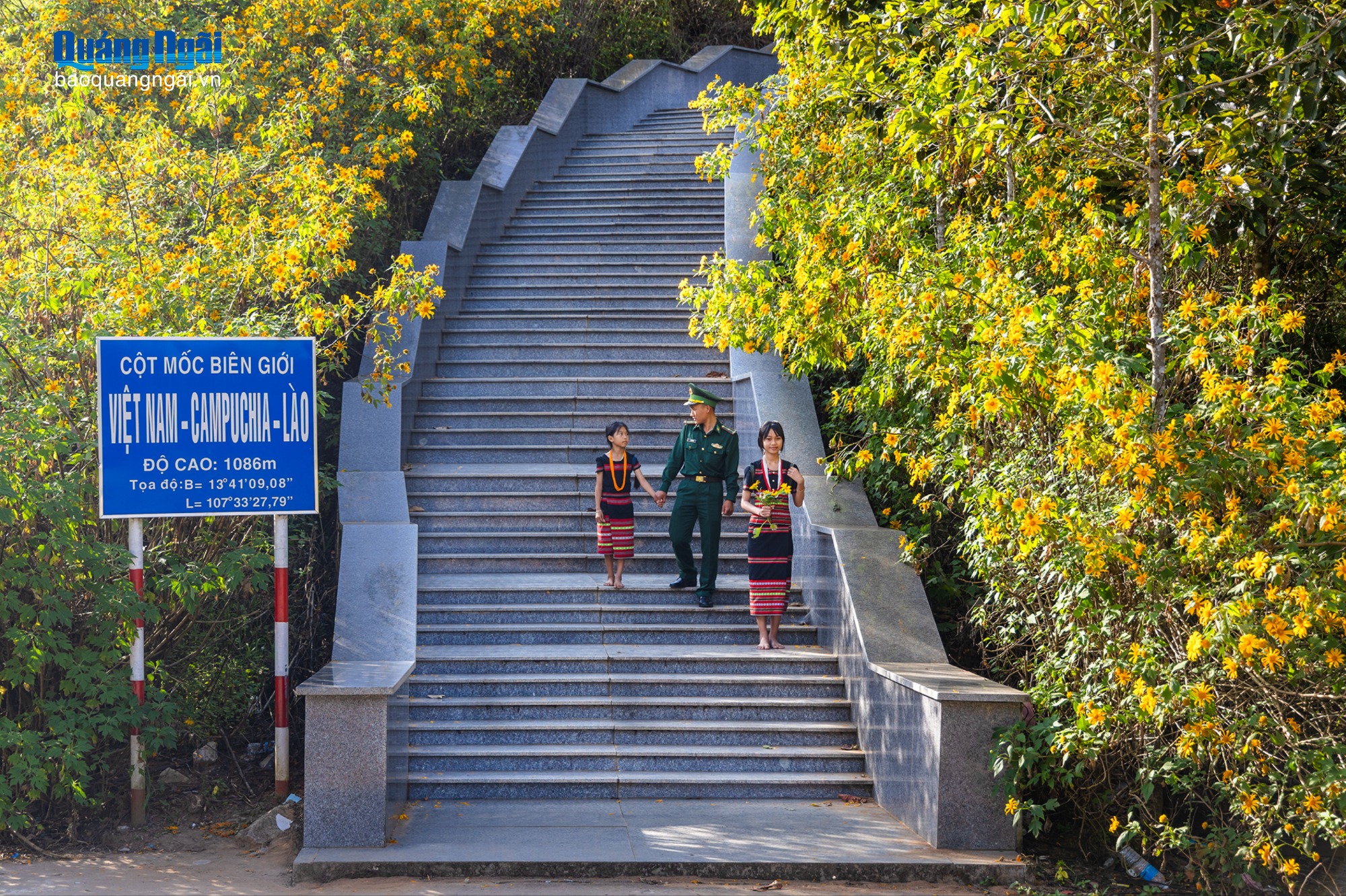 Chậm rãi từng bước dọc theo những bậc thang dẫn lên cột mốc, 2 hàng dã quỳ khoe sắc, từng đàn bướm trắng bay lượn. Từng tốp du khách say sưa chụp ảnh, lưu lại những khoảnh khắc đẹp nơi vùng biên giới.