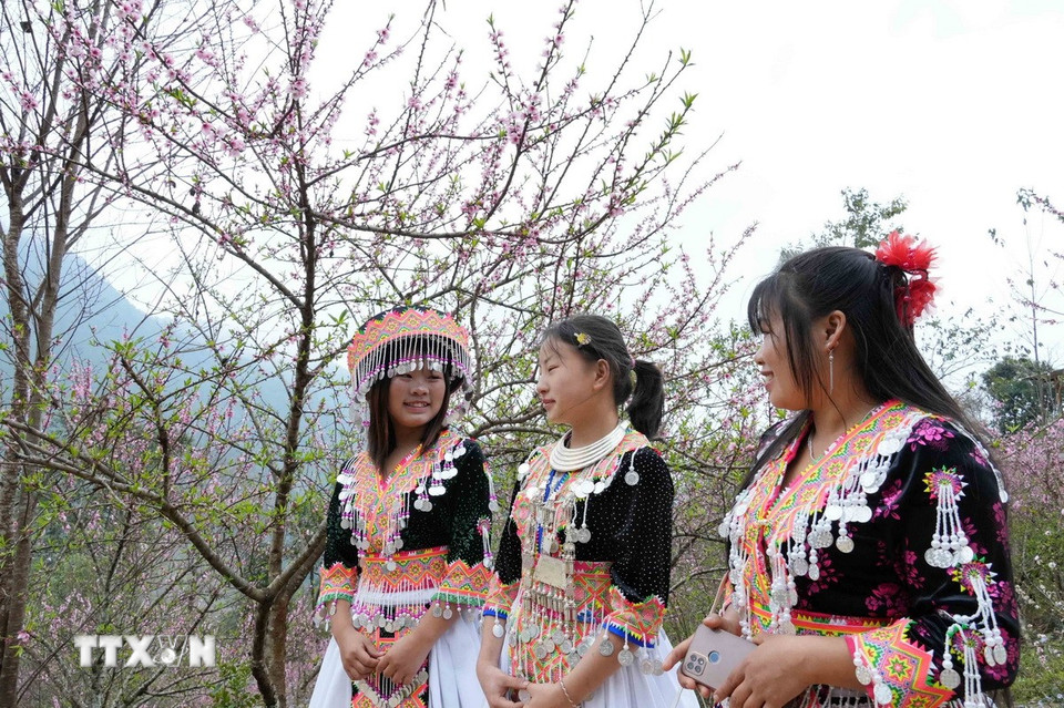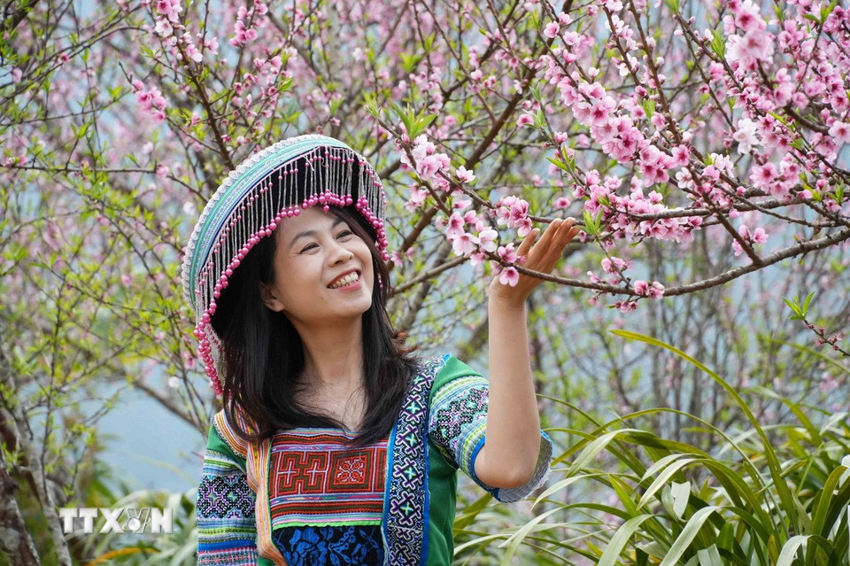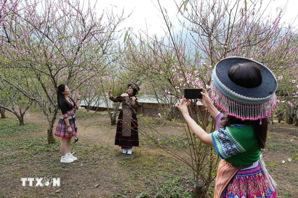 Du khách lưu lại khoảnh khắc cùng hoa đào tại bản Sin Suối Hồ, Lai Châu. (Ảnh: Nguyễn Oanh/TTXVN)