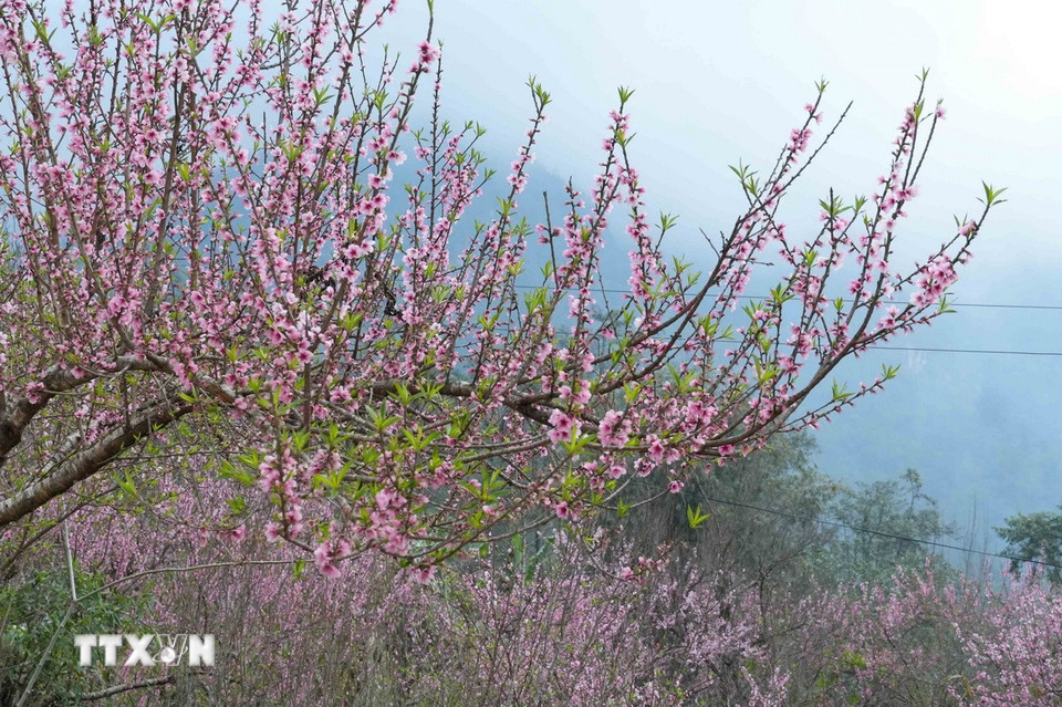 Bản du lịch cộng đồng Sin Suối Hồ (Lai Châu) tràn ngập sắc đào cuối năm. (Ảnh: Nguyễn Oanh/TTXVN)