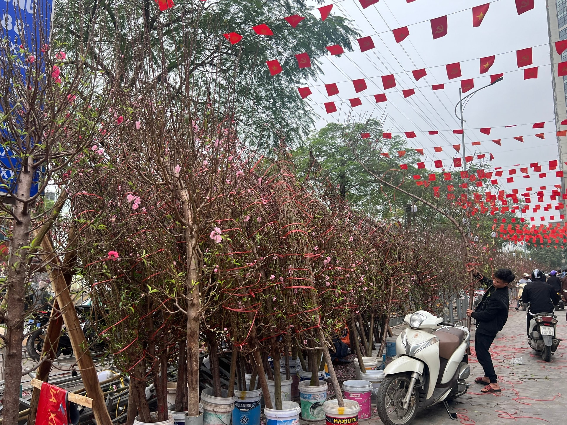 Chiều muộn ngày 12-2 (tức 25 tháng Chạp), vỉa hè đường Lê Hồng Phong (quận Hà Đông) thưa thớt người qua lại. Bà Nguyễn Thị Tú (67 tuổi, ở tổ dân phố Hòa Bình, phường Dương Nội) đứng tựa bên chiếc xe đạp cũ, trên giá đèo hàng là hơn chục cành đào nhỏ đã nở. Thấy có người dừng xe, bà nhanh nhảu mời chào: “Mua cành đào đi cháu, đẹp thế này mà chỉ 20.000 đến 40.000 đồng thôi. Mua giúp cho bà về sớm cắt hàng, mai đi bán tiếp”.