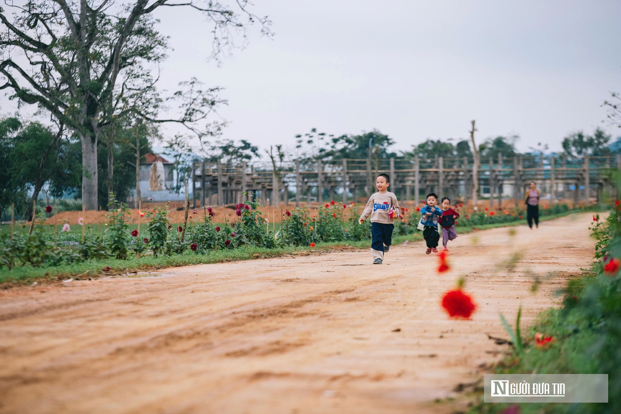 Những em nhỏ vô tư chạy đùa dưới những tán cây hoa gạo, tạo nên khung cảnh bình yên.