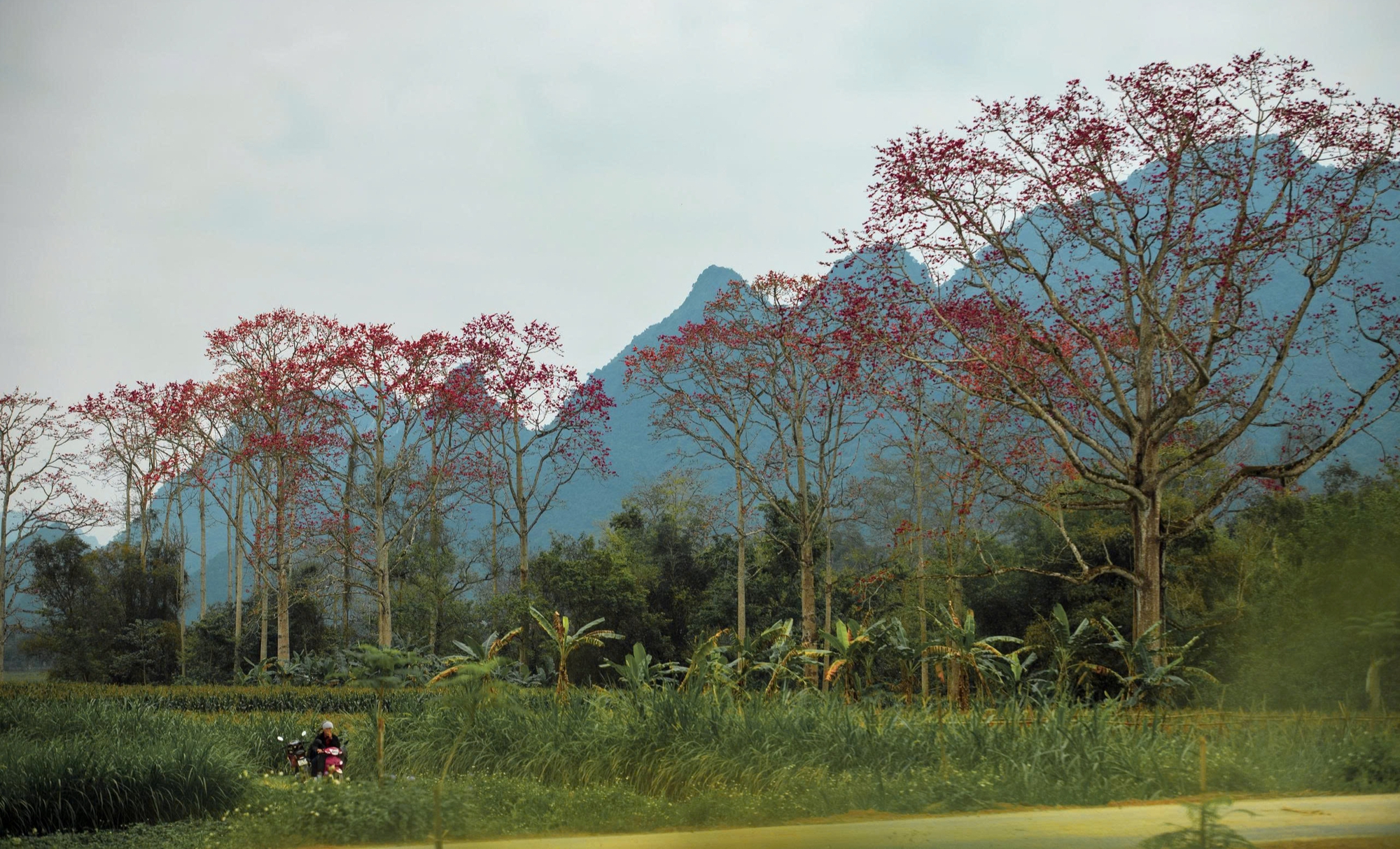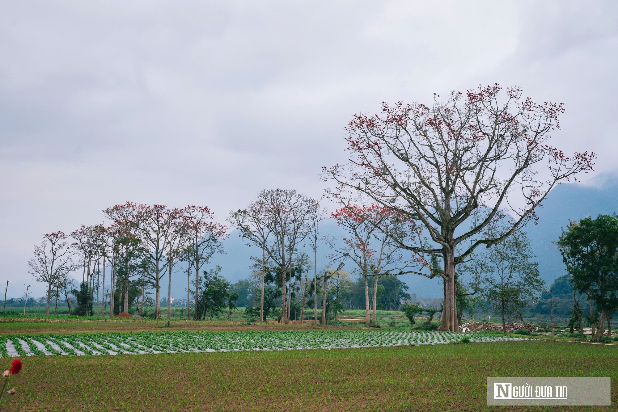 Những gốc gạo với màu đỏ chủ đạo tạo nên bức tranh nổi bật giữa khung cảnh làng quê với ruộng đồng và dòng sông uốn lượn.