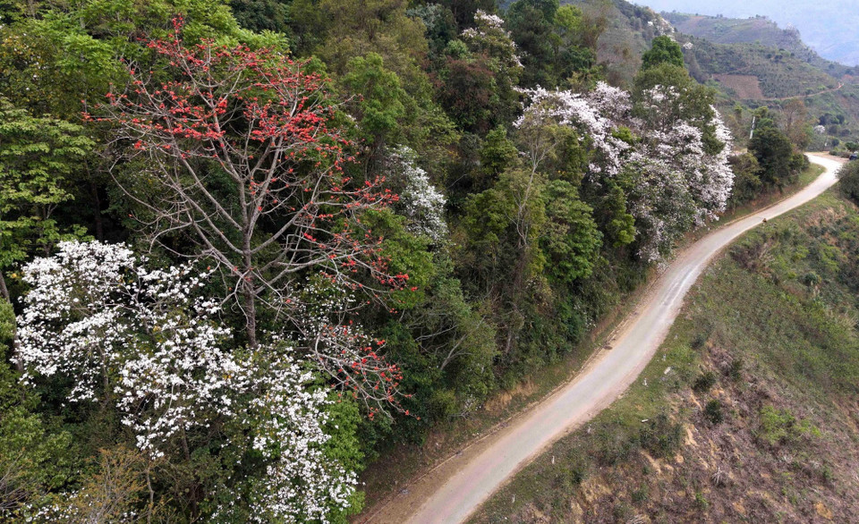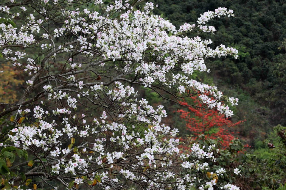 Xen giữa sắc đỏ của hoa gạo là màu trắng tinh khôi của hoa Ban, loài hoa đặc trưng của núi rừng Điện Biên. (Ảnh: Trung Kiên/TTXVN)