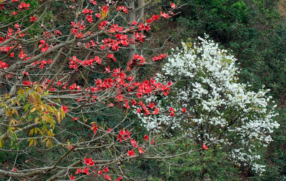 Sắc đỏ của hoa gạo và màu trắng của hoa Ban tạo nên bức tranh thiên nhiên vừa rực rỡ, vừa mềm mại. (Ảnh: Trung Kiên/TTXVN)