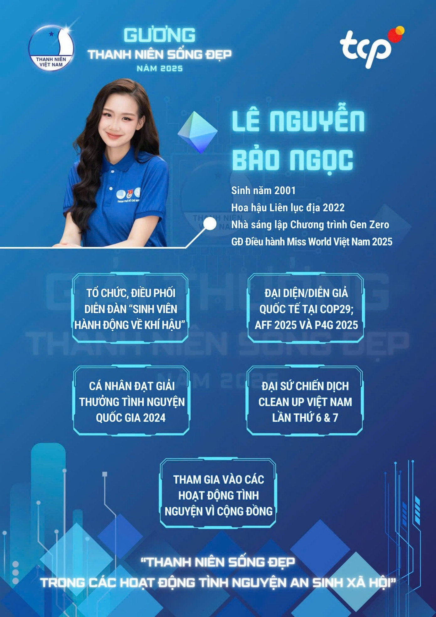 Trước đó, hình ảnh của hoa hậu Bảo Ngọc đã trở nên quen thuộc trong các hoạt động cộng đồng trên khắp cả nước. Người ta thường thấy một Bảo Ngọc năng động trong chiến dịch Xuân tình nguyện, Chủ nhật Xanh, cũng như không ngần ngại trực tiếp dọn dẹp kênh rạch, trồng cây xanh để bảo vệ môi trường. Chính những đóng góp thầm lặng nhưng đầy ý nghĩa đó đã giúp cô được vinh danh tại Giải thưởng Tình nguyện Quốc gia vào cuối năm 2024 và giờ đây là Giải Thưởng Thanh Niên Sống Đẹp năm 2025.