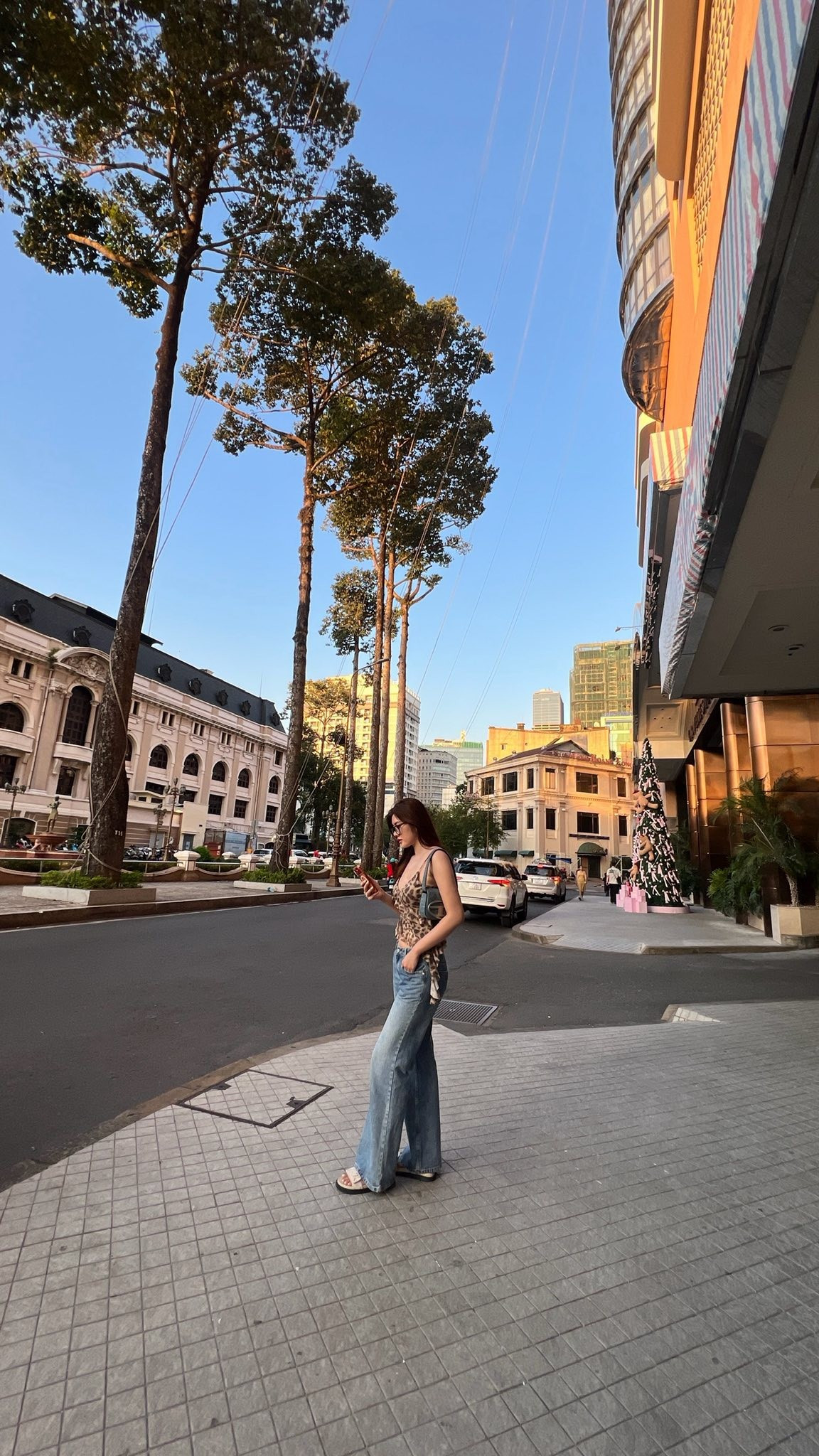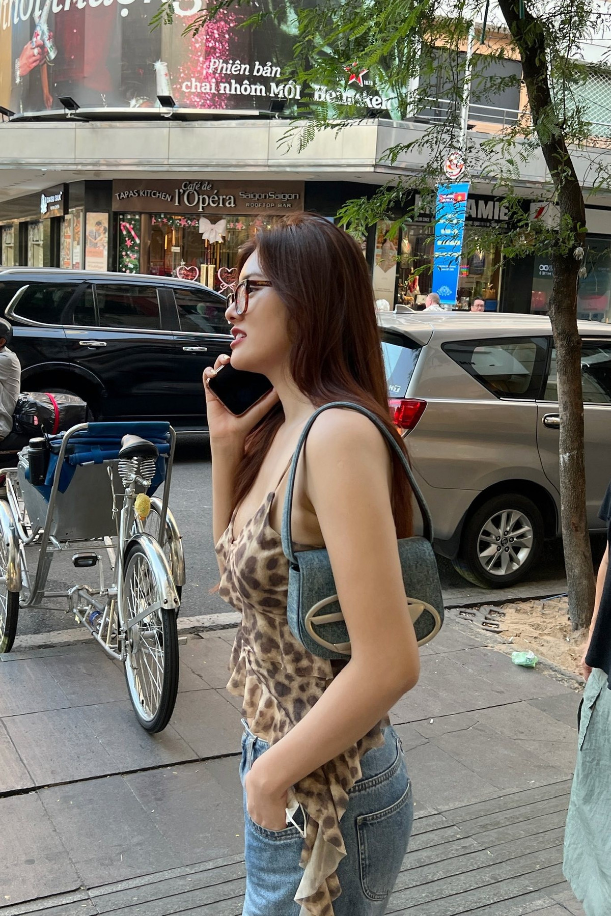 Huỳnh Tiên chọn áo hai dây họa tiết da báo, thiết kế ôm dáng nhẹ nhàng, cổ chữ V sâu tinh tế, kết hợp quần jeans xanh dáng suông – lựa chọn vừa thời thượng vừa thoải mái. Chiếc túi đeo vai màu denim đồng điệu khiến tổng thể trở nên hài hòa, trẻ trung và đầy tính ứng dụng.