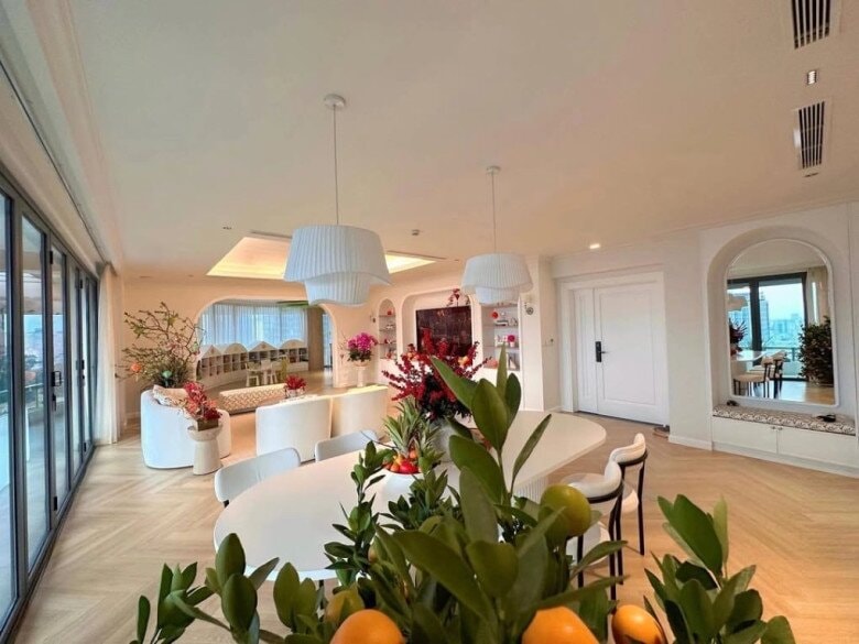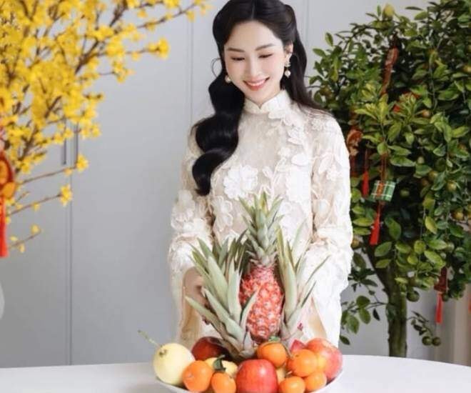 Tại căn hộ hiện đại với thiết kế cửa kính lớn và ban công rộng, Đặng Thu Thảo tự tay sắp xếp mâm ngũ quả với các loại trái cây quen thuộc như dứa, táo đỏ, quýt, cam và lê. Bố cục tròn đầy của mâm quả mang ý nghĩa tượng trưng cho sự sung túc và viên mẫn cho gia đình trong năm mới.