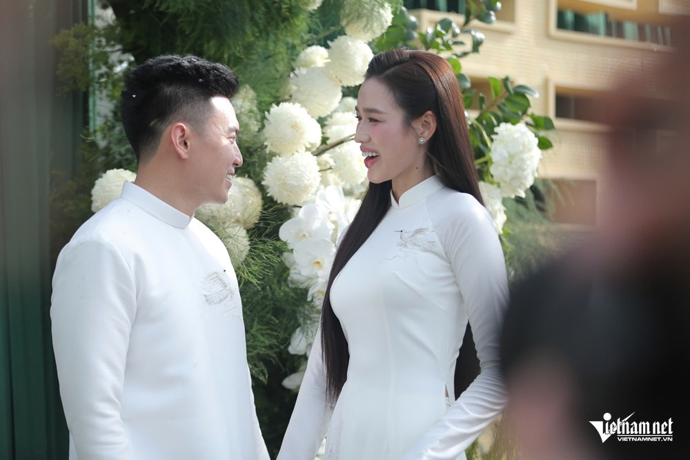 Tại đám hỏi, Đỗ Thị Hà xuất hiện trong bộ áo dài trắng đơn giản nhưng tinh tế, gương mặt rạng ngời hạnh phúc.