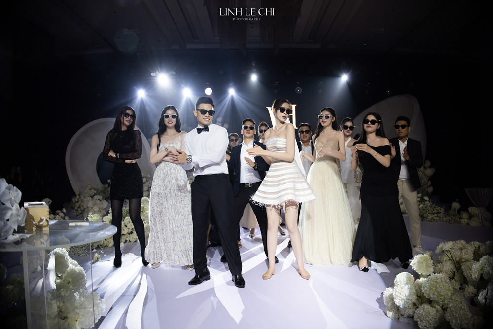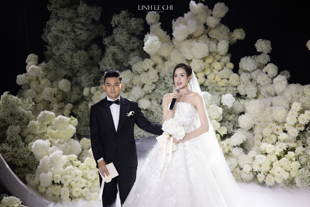 Tiệc cưới ở Hà Nội diễn ra sau hôn lễ giản dị tại quê nhà chú rể ở Quảng Trị ngày 22/10, được tổ chức theo phong cách cổ tích với biển hoa trắng ngập tràn không gian.