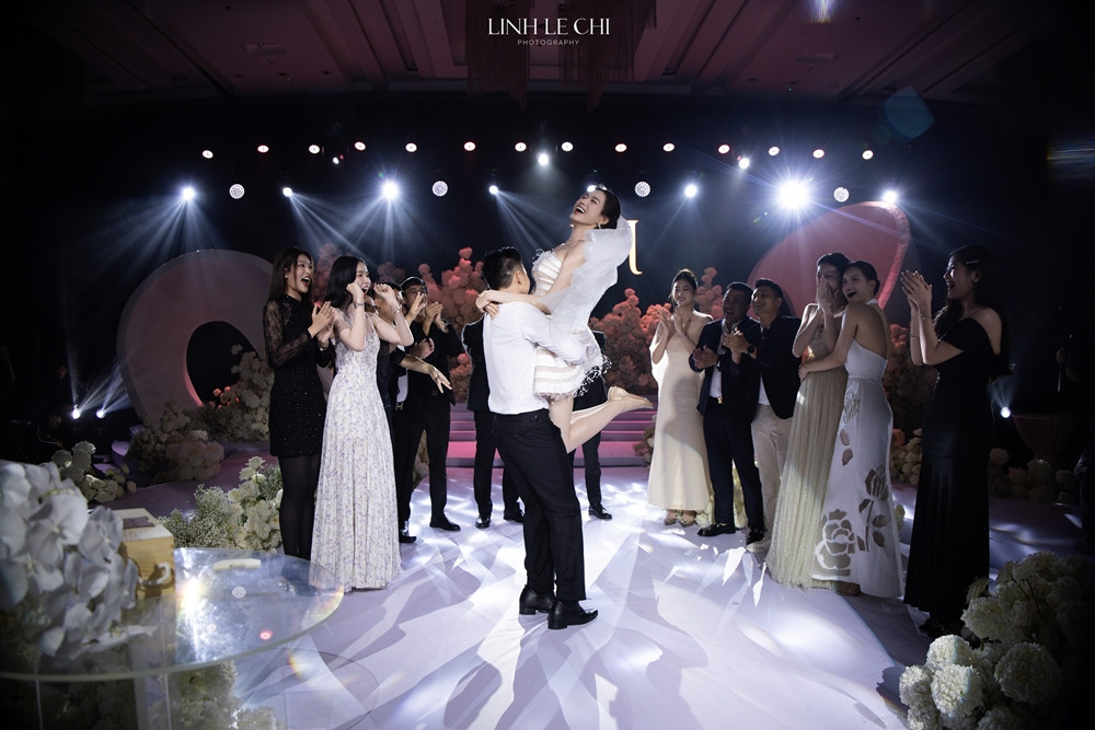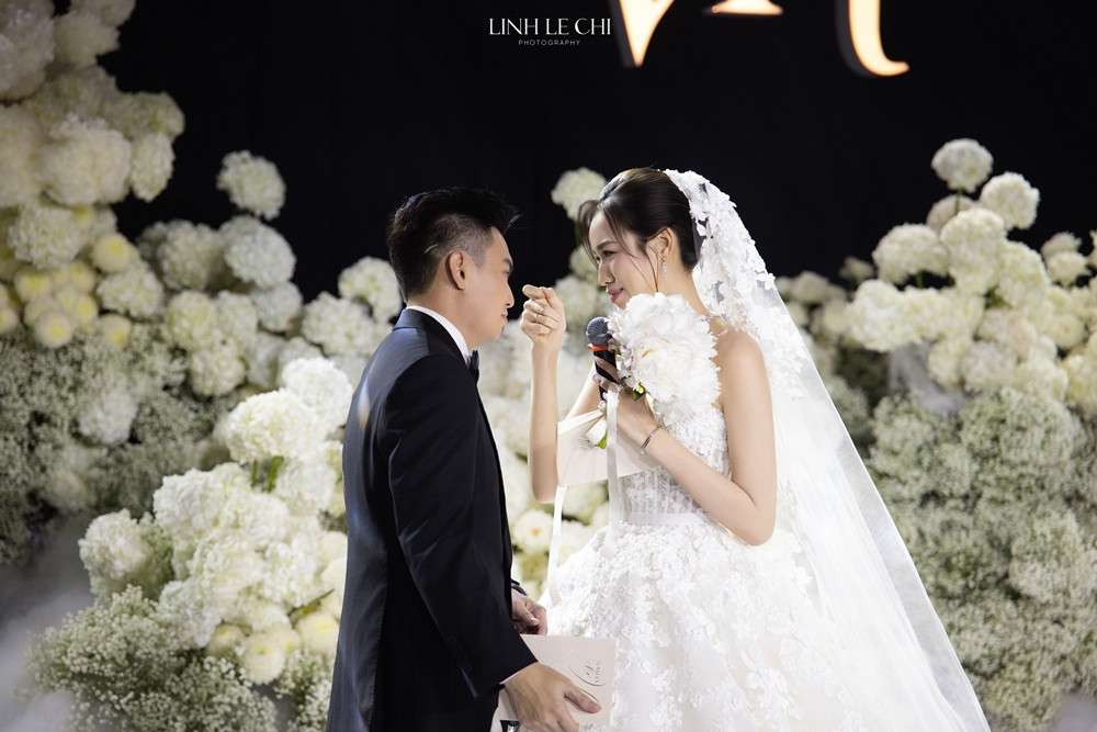 Sau lời phát biểu, không ít khách mời không kìm được nước mắt, trong đó có hoa hậu Đỗ Mỹ Linh, á hậu Hoàng Thùy, hoa hậu Lương Thùy Linh và dàn người đẹp thân thiết. Chú rể Nguyễn Viết Vương cũng rưng rưng, không ngớt trao những cái ôm và nụ hôn dịu dàng cho cô dâu.
