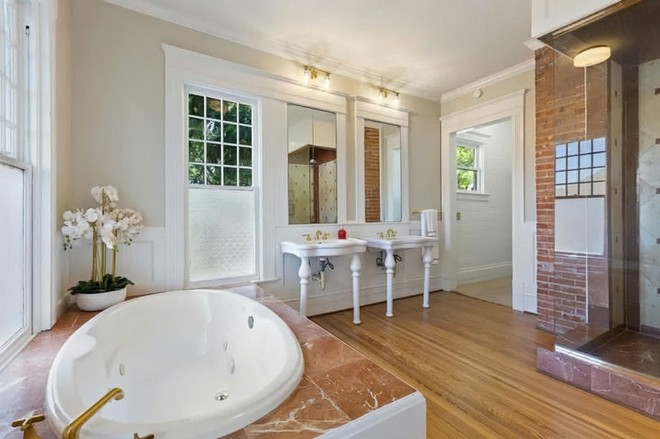 Ngôi nhà trải qua nhiều lần cải tạo, trùng tu nhưng vẫn giữ vẻ đẹp cổ điển. Phòng khách bên trong nổi bật với nhiều chi tiết gỗ màu nâu sẫm, hài hòa với sàn gỗ tự nhiên, tạo không gian sang trọng và ấm cúng.