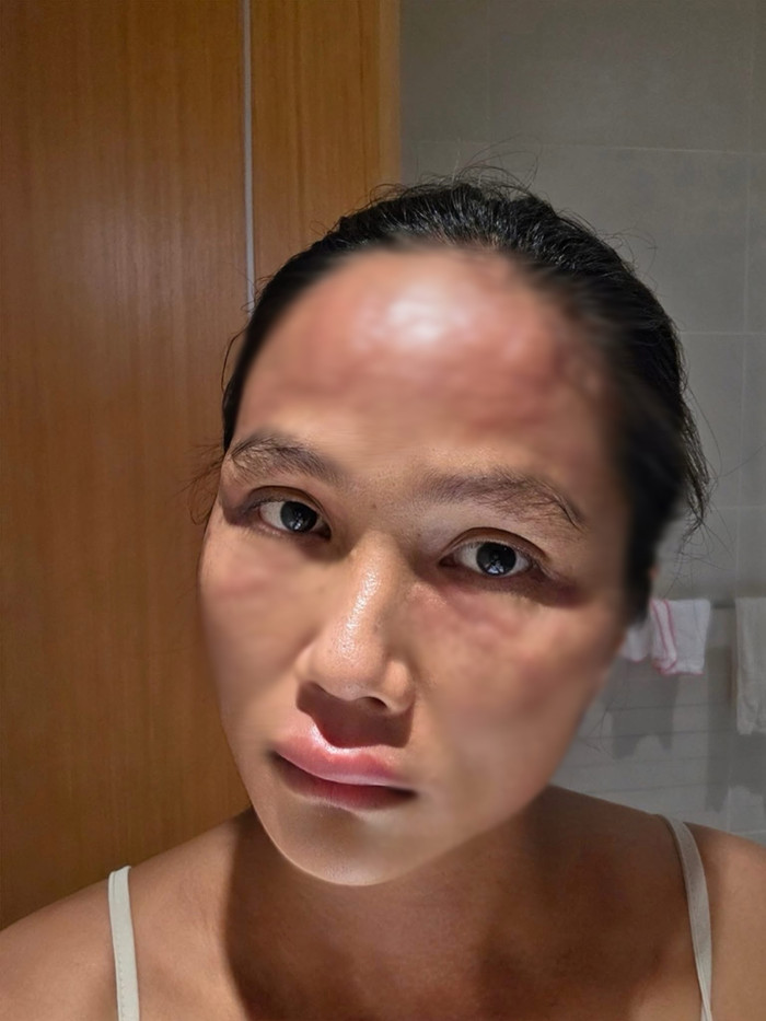 Không còn hình ảnh rạng rỡ, lộng lẫy trên màn ảnh, H'Hen Niê đăng tải hai bức hình cho thấy mặt, môi và nhiều vùng khác trên cơ thể mẩn đỏ, sưng nề - biểu hiện điển hình của căn bệnh nổi mề đay sau sinh.