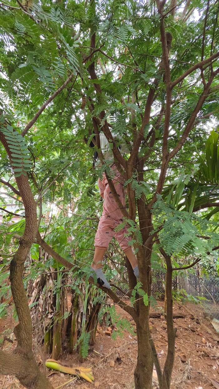 Khoảnh khắc nàng hậu tự trèo cây, hái trái khiến nhiều netizen bật cười.